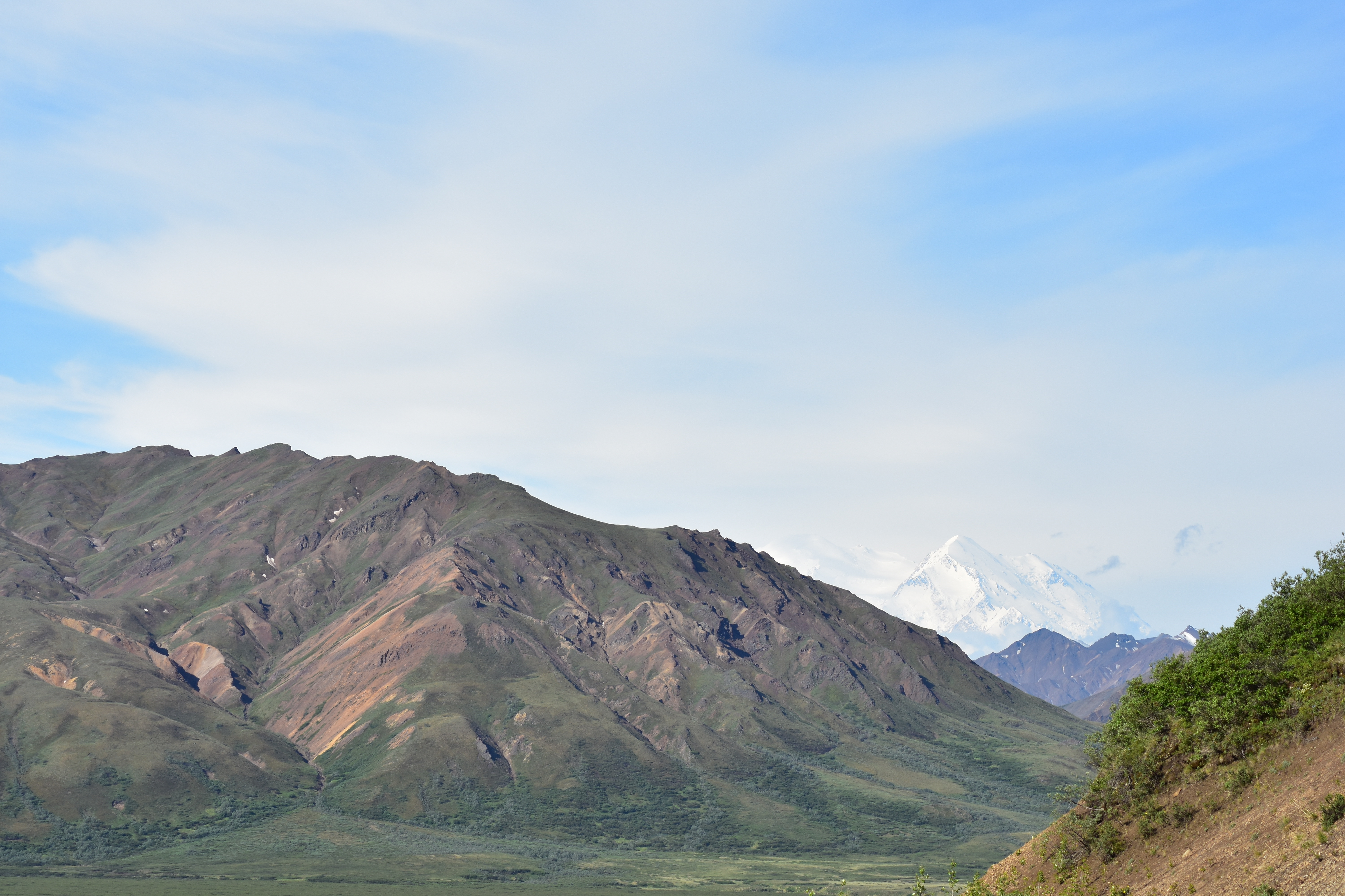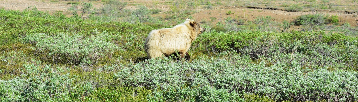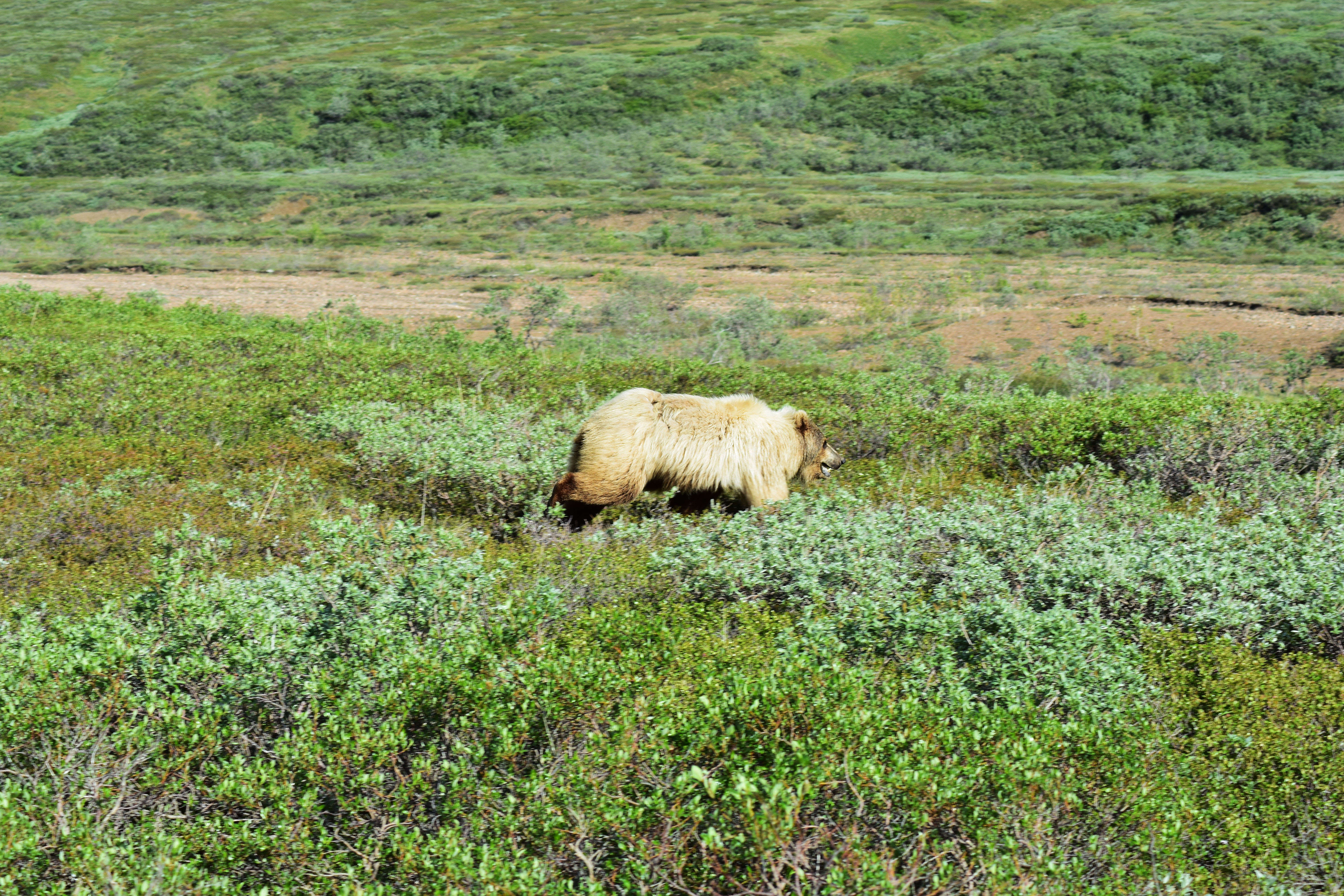 We were getting excited about the prospect of seeing the mountain as the sky was clearing up and we could see it peaking out during the drive. The driver still wanted to make sure and stop to show us the wildlife, but we also knew the longer we drove the clouds may come back out and cover the mountain. The bus driver was good about stopping when she saw animals. As we were driving she said we are going to stop because some of the buses were stopped up ahead. The reason for the stopping was a grizzly bear!!!! That is exactly what I had been hoping to see on this trip. I was so excited to watch him run in the field around the bus, then he ran in front of the bus. It was so exciting how close he came to the bus.