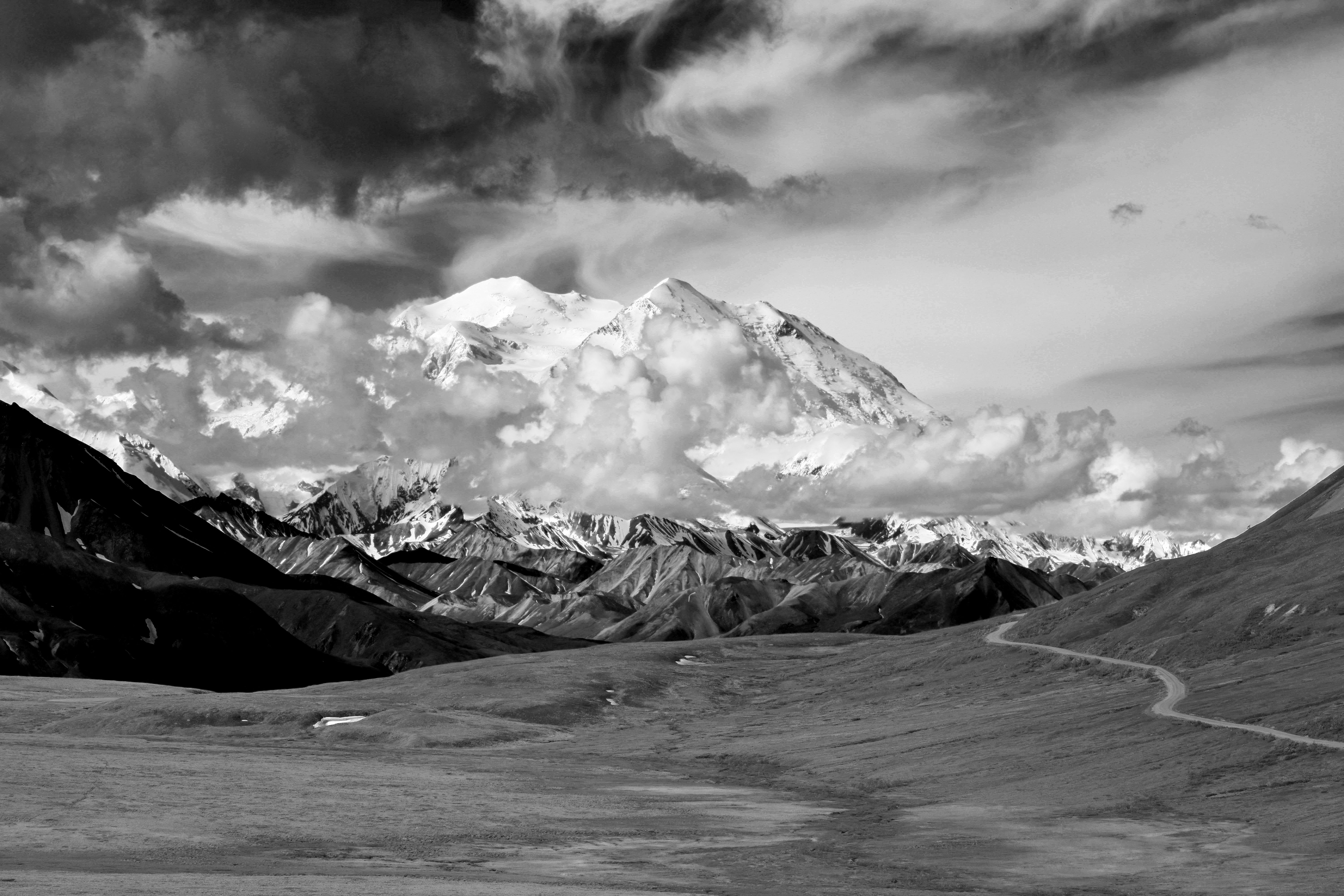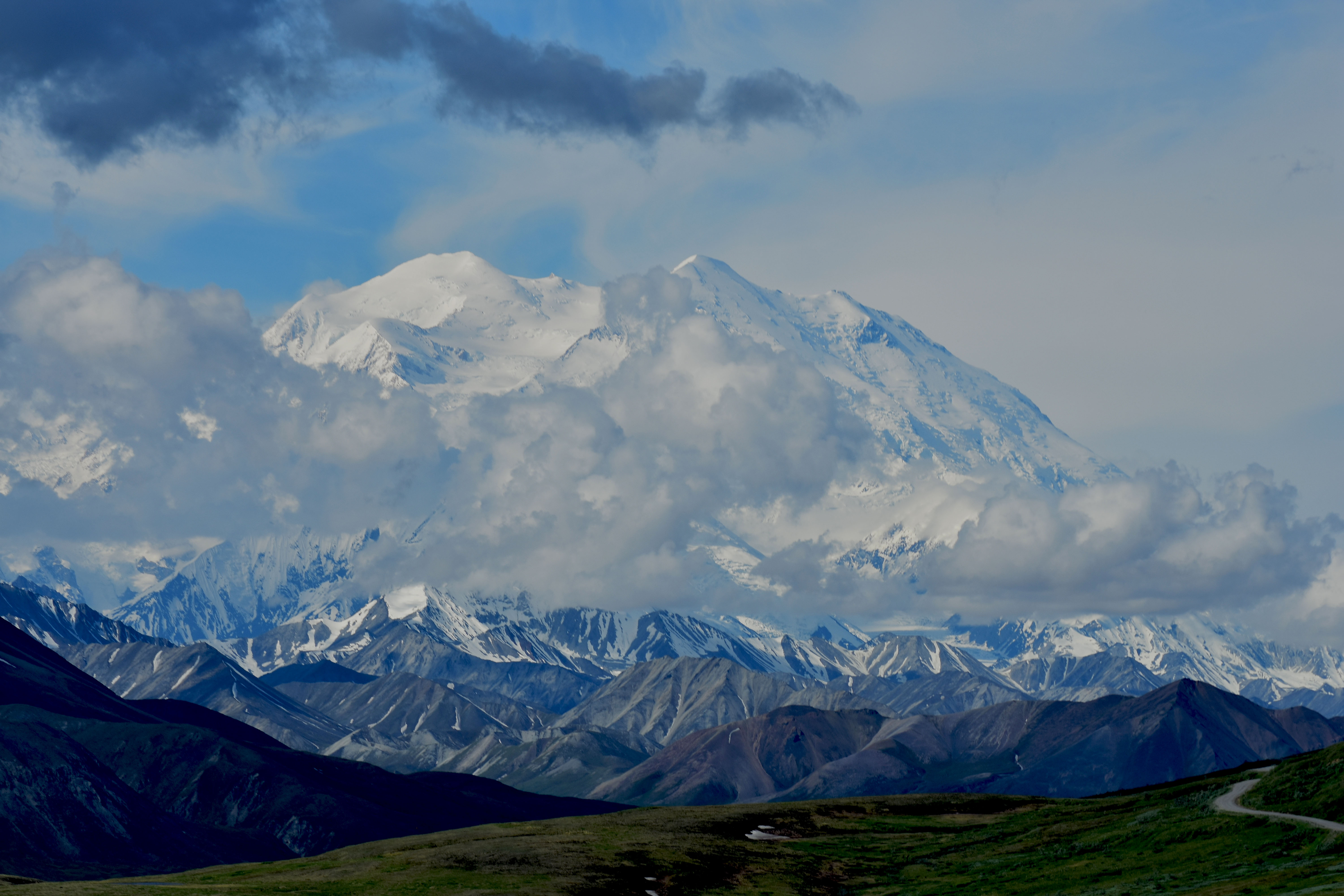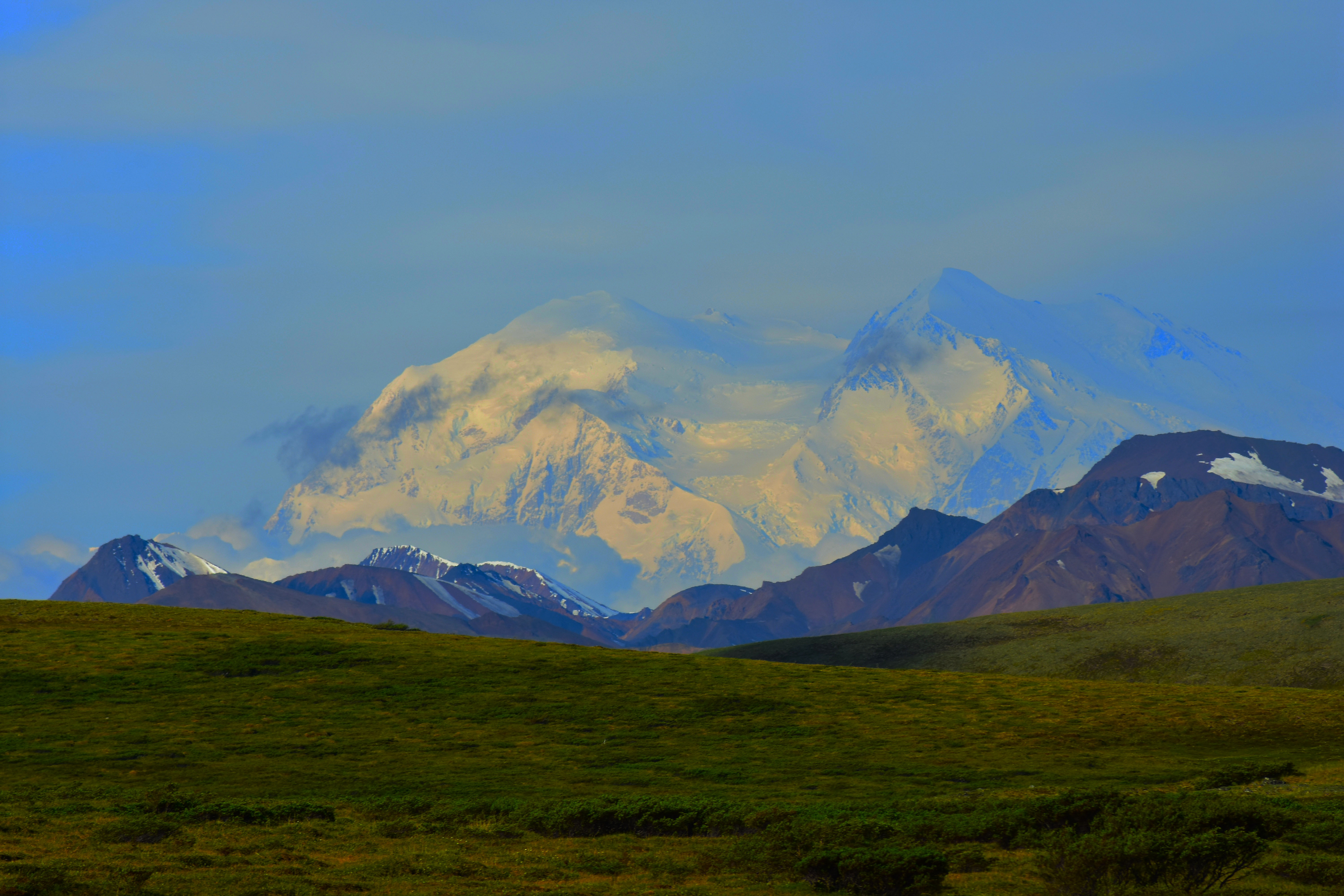 We were getting excited about the prospect of seeing the mountain as the sky was clearing up and we could see it peaking out during the drive. The driver still wanted to make sure and stop to show us the wildlife, but we also knew the longer we drove the clouds may come back out and cover the mountain. The bus driver was good about stopping when she saw animals. As we were driving she said we are going to stop because some of the buses were stopped up ahead. The reason for the stopping was a grizzly bear!!!! That is exactly what I had been hoping to see on this trip. I was so excited to watch him run in the field around the bus, then he ran in front of the bus. It was so exciting how close he came to the bus.