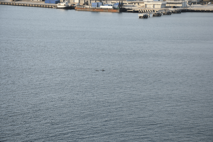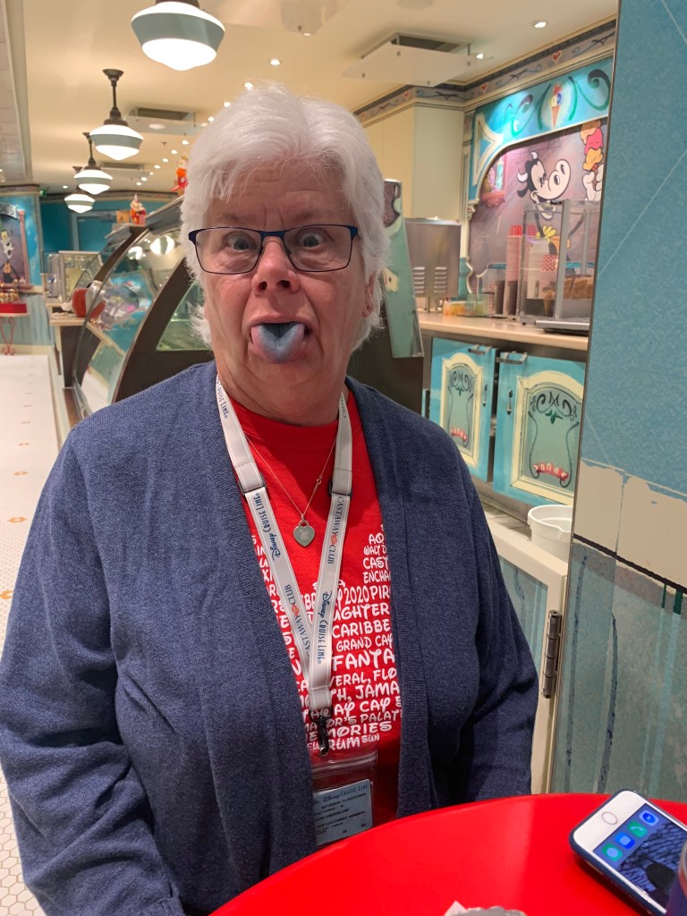 I had the Salmon Salad and the Welcome Aboard sundae. It was very good. After lunch we headed up to the 11th floor and found a nice place outside the Cove to relax and wait until our room was ready. We headed down to floor 10 and drop off our bags. My suitcase was there waiting at the door (mom’s didn’t arrive for a couple more hours).We did see the doors and elevators that the staff uses to bring up all of the suitcases and their supplies. It was pretty cool! We did see bags still being put out around 6 pm. Luckily I have never had a bag arrive that late.  After I unpacked my bag we went up to the Spa to try and win a price. Sadly we did not win a drawing (spoiler Day 3 I get a certificate for $50 off acupuncture, I don’t do it). After the Spa we stopped by the room to relax and mom’s was there when we went to leave (so about 4:00). Then we relaxed in the room for a few minutes until it was time for the drill. Our drill location was inside the Buena Vista Movie Theater, so yes we sat in the AC and in comfy chairs). This would have been so much better when we had all the kids! After the drill we went and got our detective case!  Mom is trying to find out who stole the puppies and get them back. I am on a Muppet case (honesty I don’t know what the crime is). While standing on our balcony as we left port we saw some dolphins!