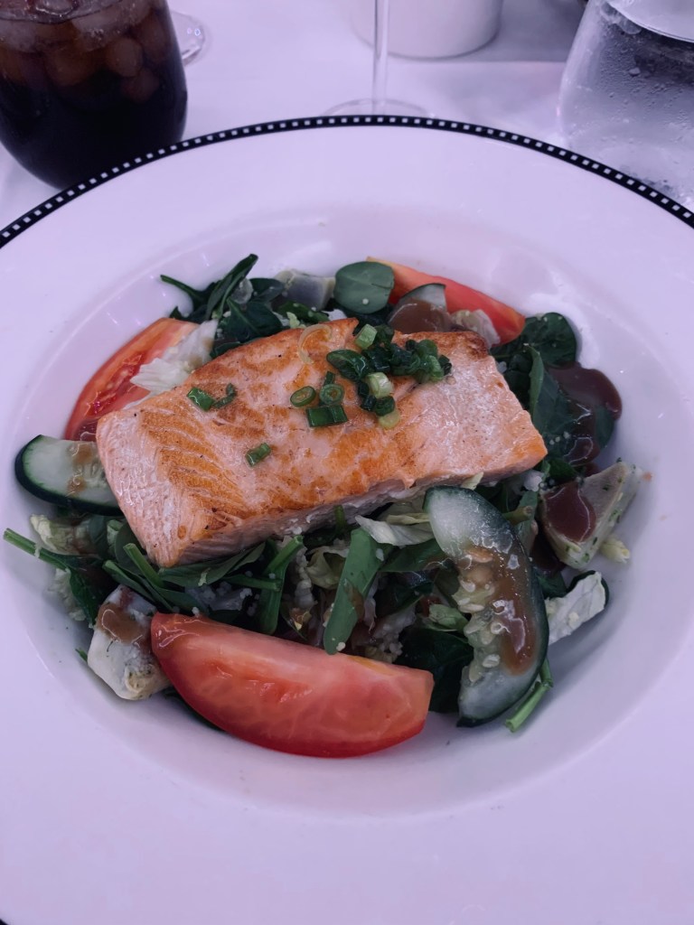 Grilled Salmon Salad- salmon fillet on tossed iceberg, citrus-marinated couscous, spinach, artichokes, tomatoes, and cucumbers