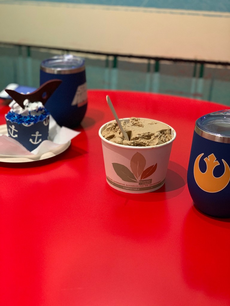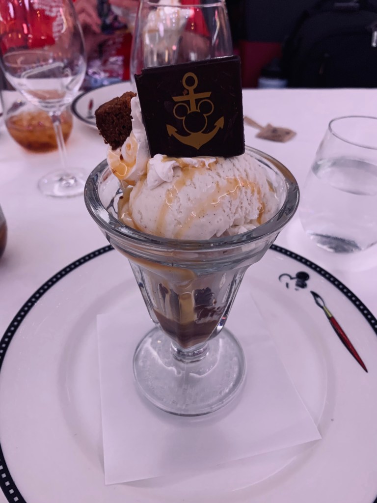 Welcome Aboard Sundae – vanilla bean ice cream with pecan caramel cupcake bites, butterscotch sauce, and whipped cream.
