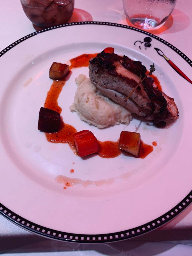 Lemon-Thyme Marinated chicken Breast (very good)- on top of sour cream mashed potatoes, roasted root vegetables and Grain mustard Jus.. We skipped dessert!!! At least at Animator’s, we didn’t see anything we loved there.