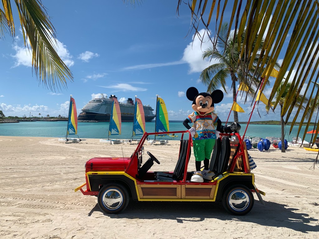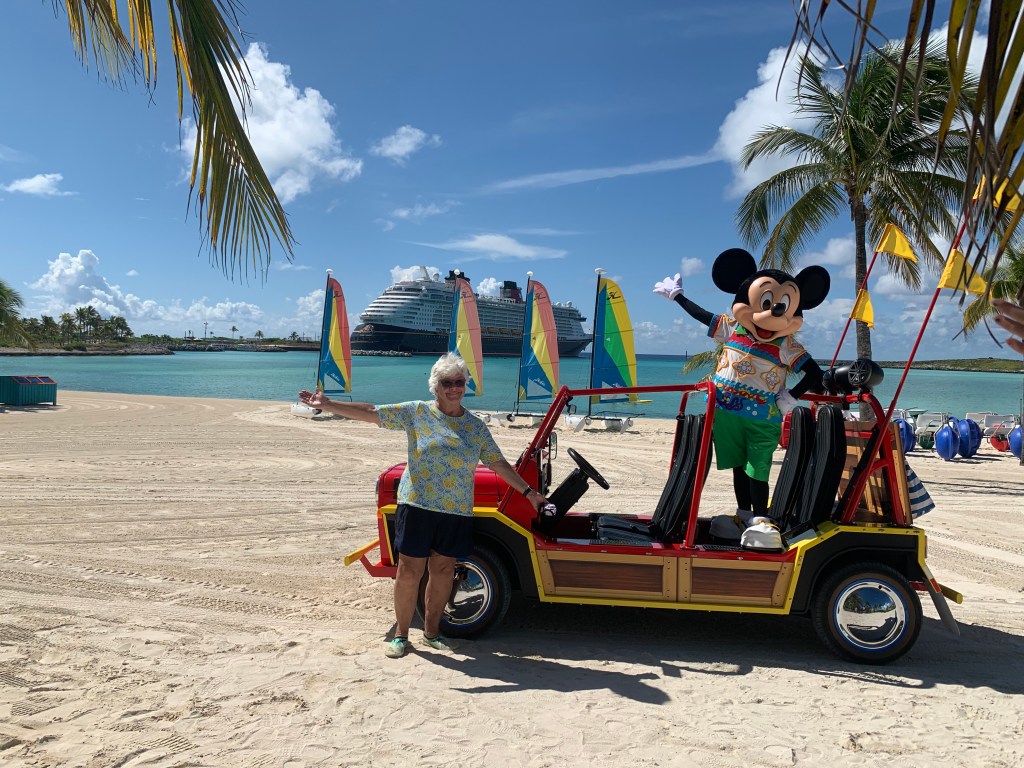Once we made it back safely to shore, we saw Mickey chilling on his jeep like vehicle, so mom was able to get a picture.