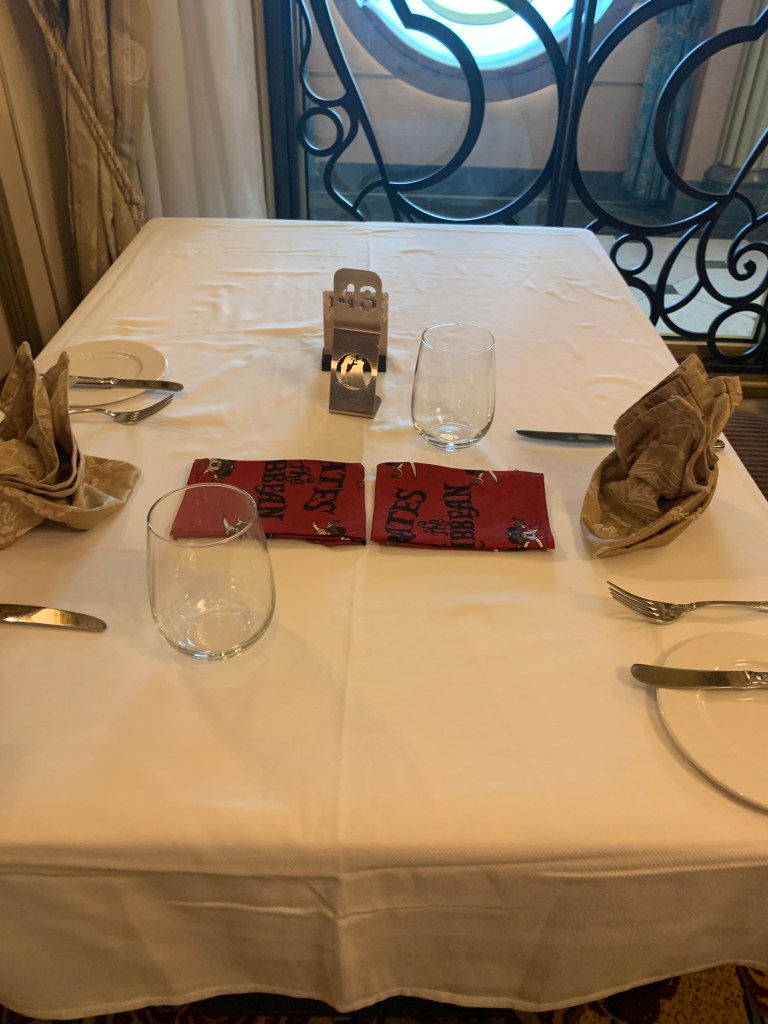 Dinner was in Royal Court again tonight since it was Pirates Night. The dinner was also Pirate Themed, the cast members were dressed in pirate gear, and some pirates came into the dinning rooms. The pirate that was doing all the talking had a very high pitched voice, so we could not always understand what she was saying. There were other pirates that came around the room and they sang some pirate songs.