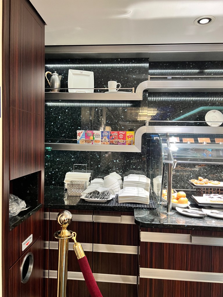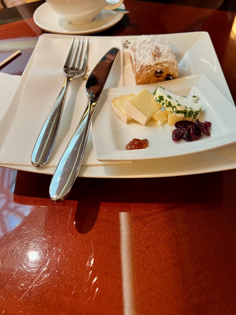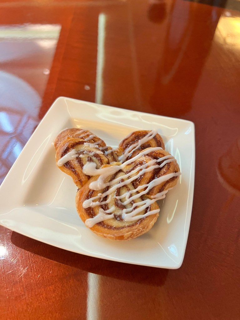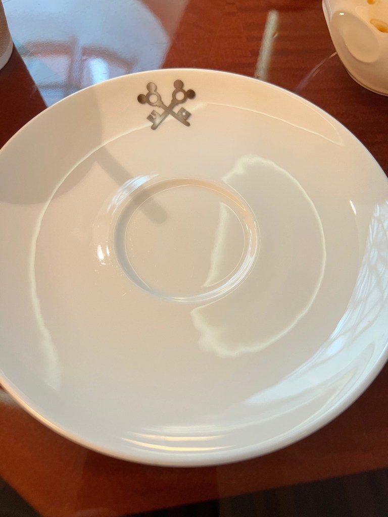 Breakfast selection of breads and pastries in the lounge. Right now they serve you food. Looking at the food and drink area in the lounge.Coffee machine. We would ask for real cups while drinking our coffee if we were going to sit in the lounge or our room. Drinks section – Coffee, tea, water, milk, coke. I think they had some juice in the morning. We decided to try the Mickey cinnamon rolls. They were yummy, probably because the look like Mickey ears. There was also a selection of cerealI ordered an Espresso for fun. I forgot to ask for sugar! It was still fun drinking an espresso. Kelle and I also go some cheese and a chocolate croissant. The saucers in the lounge even have the crest. So much fun.