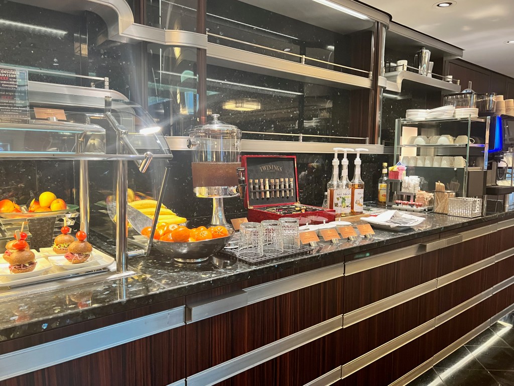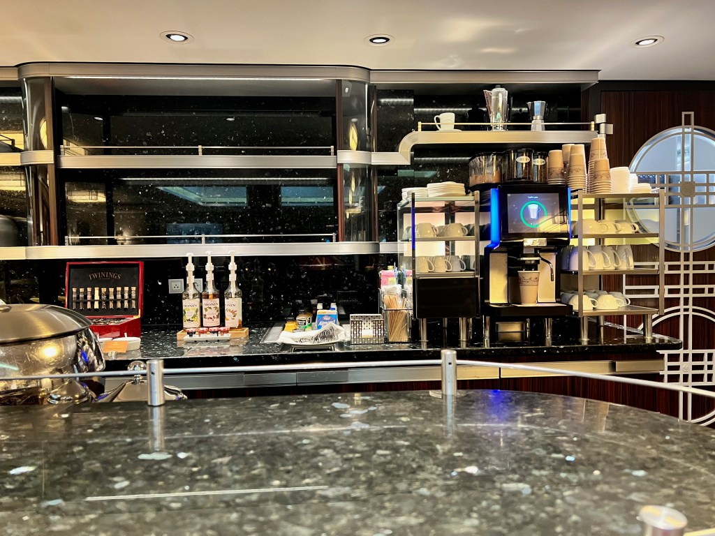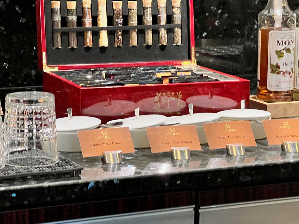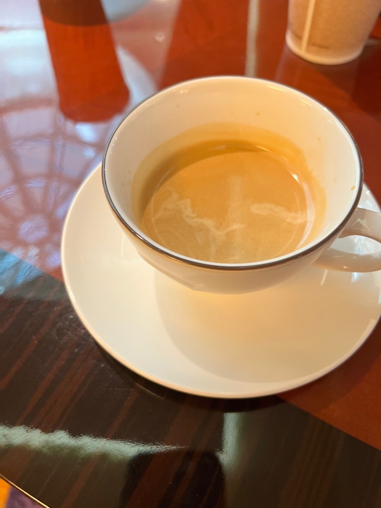 Breakfast selection of breads and pastries in the lounge. Right now they serve you food. Looking at the food and drink area in the lounge.Coffee machine. We would ask for real cups while drinking our coffee if we were going to sit in the lounge or our room. Drinks section – Coffee, tea, water, milk, coke. I think they had some juice in the morning. We decided to try the Mickey cinnamon rolls. They were yummy, probably because the look like Mickey ears. There was also a selection of cerealI ordered an Espresso for fun. I forgot to ask for sugar! It was still fun drinking an espresso. Kelle and I also go some cheese and a chocolate croissant. The saucers in the lounge even have the crest. So much fun.
