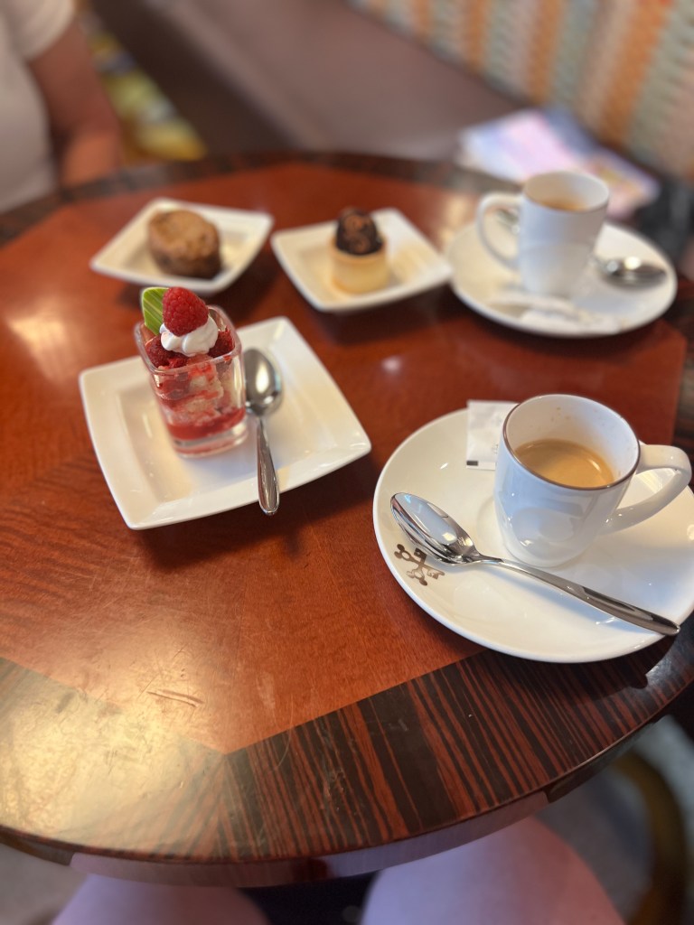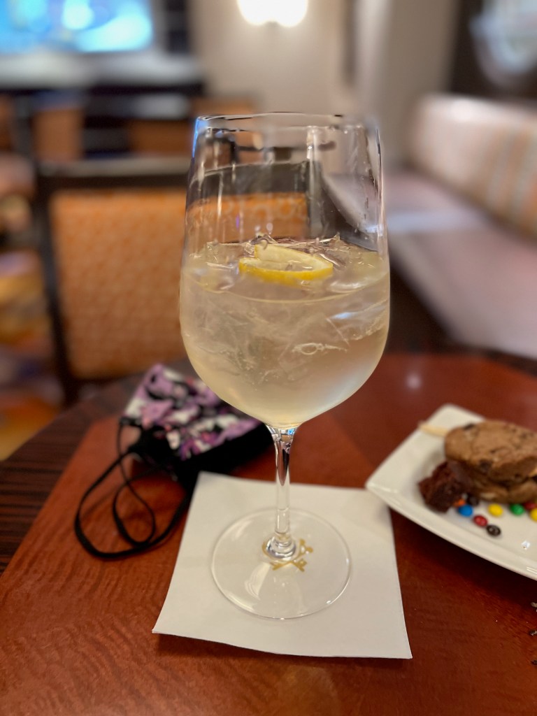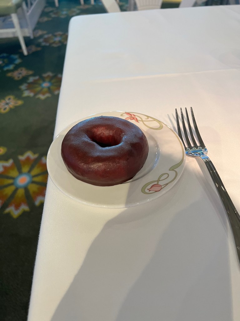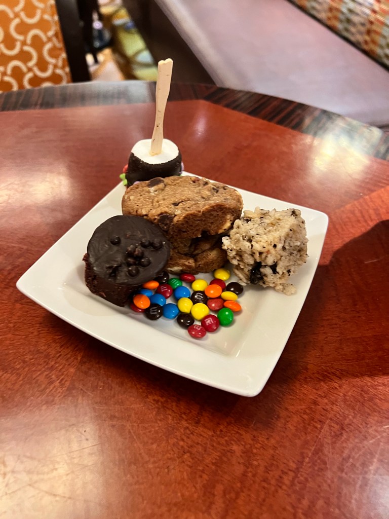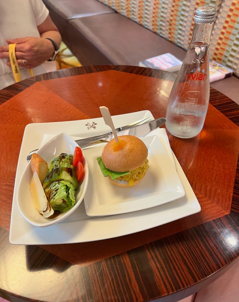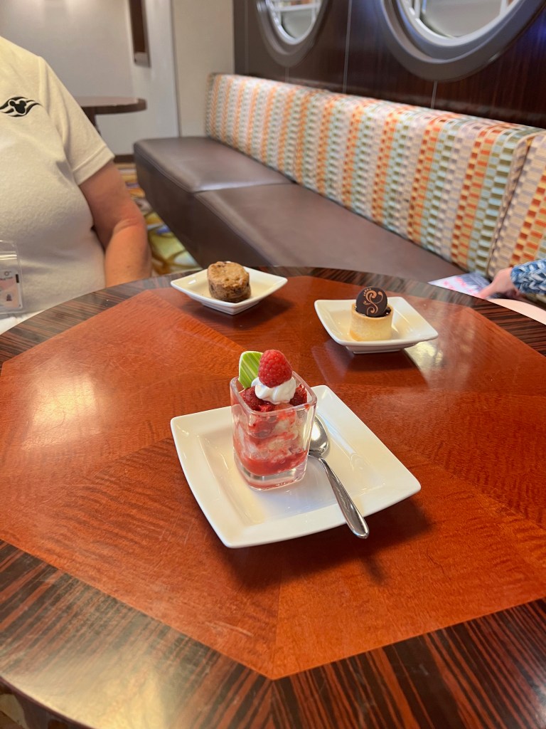 Yummy chocolate donutFruit plate with blueberries, strawberries, mango, papaya, and raspberries DCL express- hash browns, scrabbled eggs, bacon, sausage, and a grilled tomato Mickey and Minnie enjoying some beach time. Goofy was also out at the beach today.During the 5K we decided to take a walk up to the top of the tower and enjoy the view and wind from up top. View of the ship from the top of the tower. Once we were finished checking out the views we completed the 5K. By the time we finished the medals were back on the ship, so we had to ask at Guest Services for them. A view of the ship as we walk back after finishing up the 5K. With the late state from breakfast after we finishing the 5k and did some shopping on the Island. It was about 11:15am and we decided to skip eating on the Island and head back to the ship. After getting back to the ship and changing for the pool. We stopped in the lounge to grab a bite. We had gotten a little sunburned while out, so I asked the concierge host for some sunscreen. I was given a full-size bottle of sunscreen!Lunch selection Dessert selection Different fruits and drink selection We learned you didn’t have to get sugar packet they had sugar cube you could get when asked. I decided to get the salad (it was lettuce with red bell peppers, cucumbers, and tomatoes) wrapped in cucumber. I also had the curry chicken salad sandwich. Dessert- strawberry shortcake, M&M cookies, truffle tart.For fun we decided to get an espresso. This time I remembered to ask for some sugar. After we finished eating we went up to the 13th deck and hung out at Satellite Falls . Then we came back to the concierge sundeck. I chilled in this chair and read my book. Kelle and I went into the hot tub and relaxed for a little while. Before dinner we stopped back in the lounge and got a drink. They had a large selection of liquors to choose from. I had the limoncello Spritz. Dinner was at Animators. I started with the Black Truffle Pasta House salad with Balsamic Vinegar Chicken with potatoes and veggies Cookies and cream Sundae After dinner back in the room we had Zero waiting on us. Kelle and I went to the Spa for about an hour. The rainforest was a little different this time. Instead of getting to go all weekend, you just get 90 minutes, but have the place to yourself. I was good and left my phone into the room which was too bad since it was just the 2 of us there. Kelle and. I checked out of all the water rooms, and the saunas. We then laid on the heated loungers for a little while and then got into the hot tubs. There were 2, so Kelle and I were both able to relax. We were in the perfect spot to see the first set of fireworks from the hot tub. After the fireworks were over we went and checked everything out again. It is a good thing we were by ourself because we were loyd laughing and playing in the different water features. After spending time at the Spa Kelle and I went back into the lounge since it was open until 10pm. We got another drink and James our server in the lounge decided we needed to try all the treats. We had chocolate brownie, m&m cookies, rice crispy, and mini m&ms.