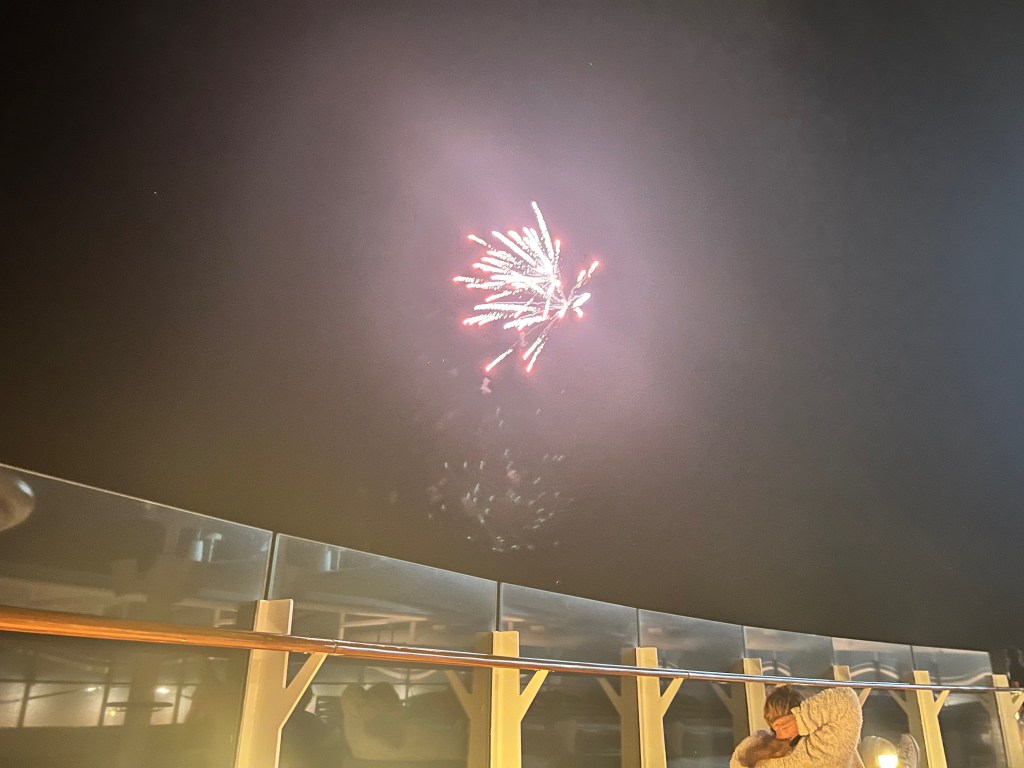 We meet up with the concierge host in the lounge at 10:30 to go upstairs to get a view of the fireworks. It was really windy up there, but fun to see the fireworks again. Then off to bed!