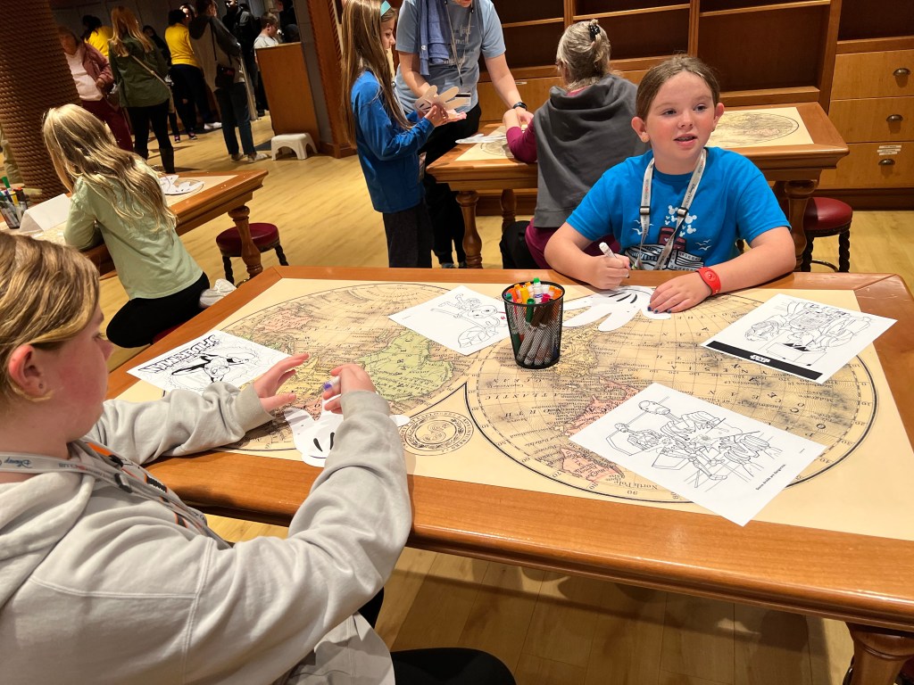 The girls found the craft area and colored a Mickey Hand for the Sail away party.