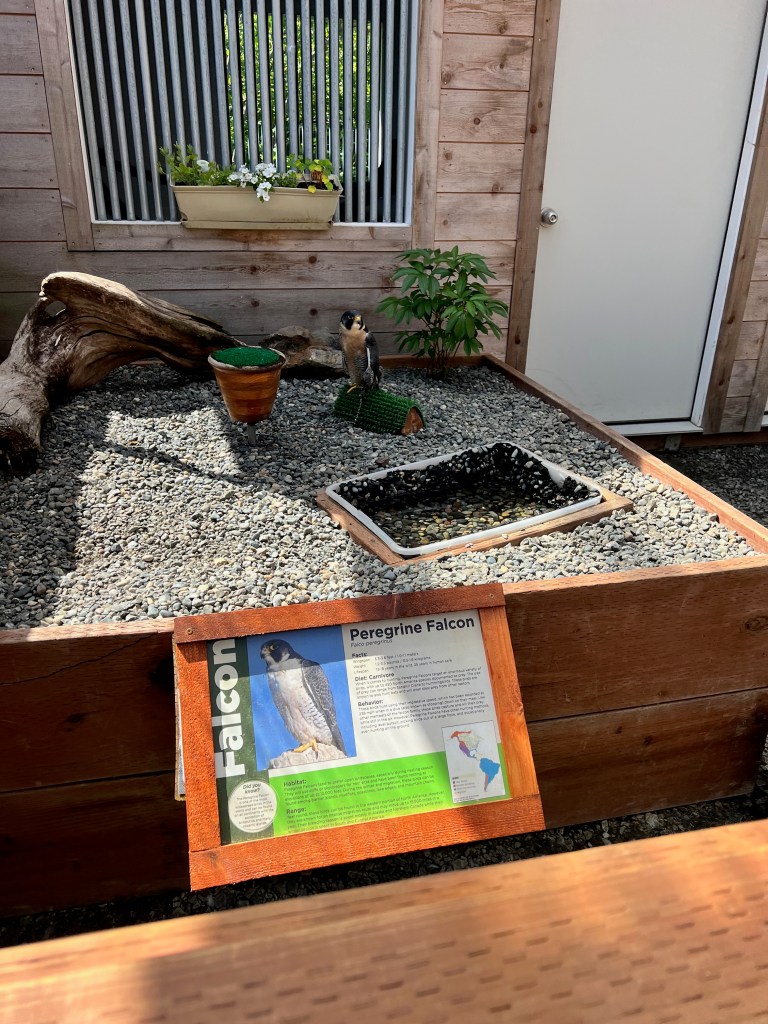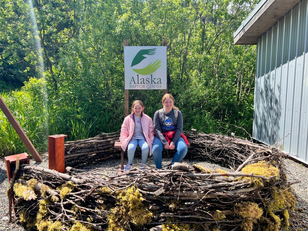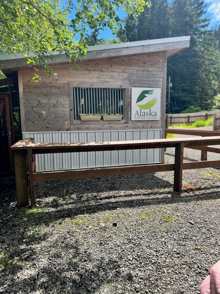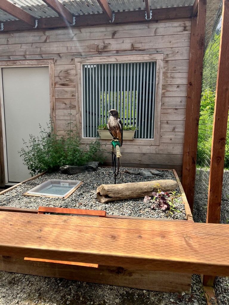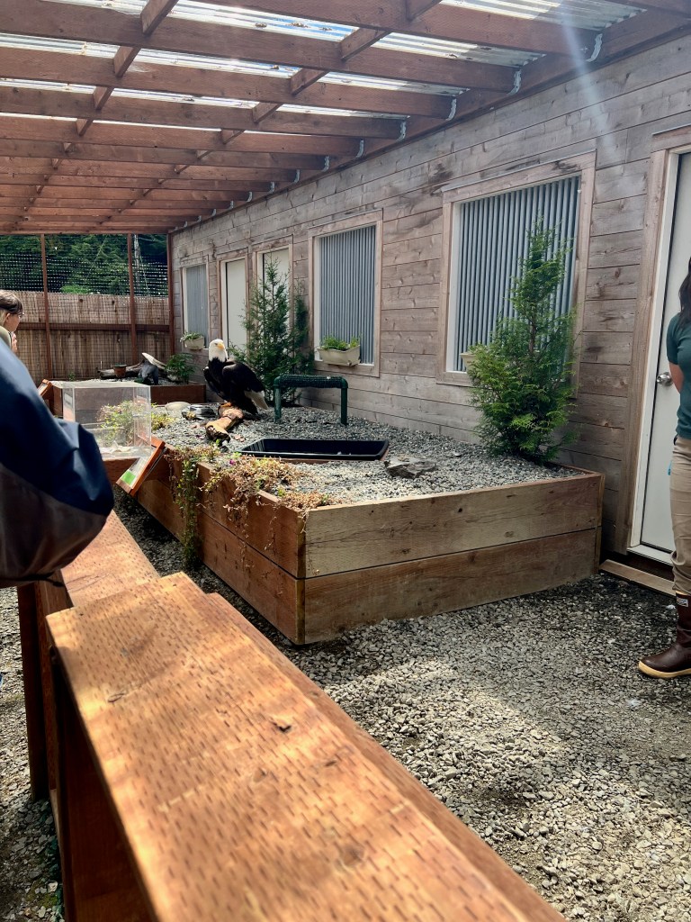 Sitka the Bald Eagle was much large than I thought they would be. He had been eating on a moose carcass when a car drove by he flew out in front of the car. He has a hole I his wing and is missing some claws on his feet. His accuracy at catching live prey was less than 50%, so they couldn’t release him. Healthy Eagles have an 80% success rate when hunting.