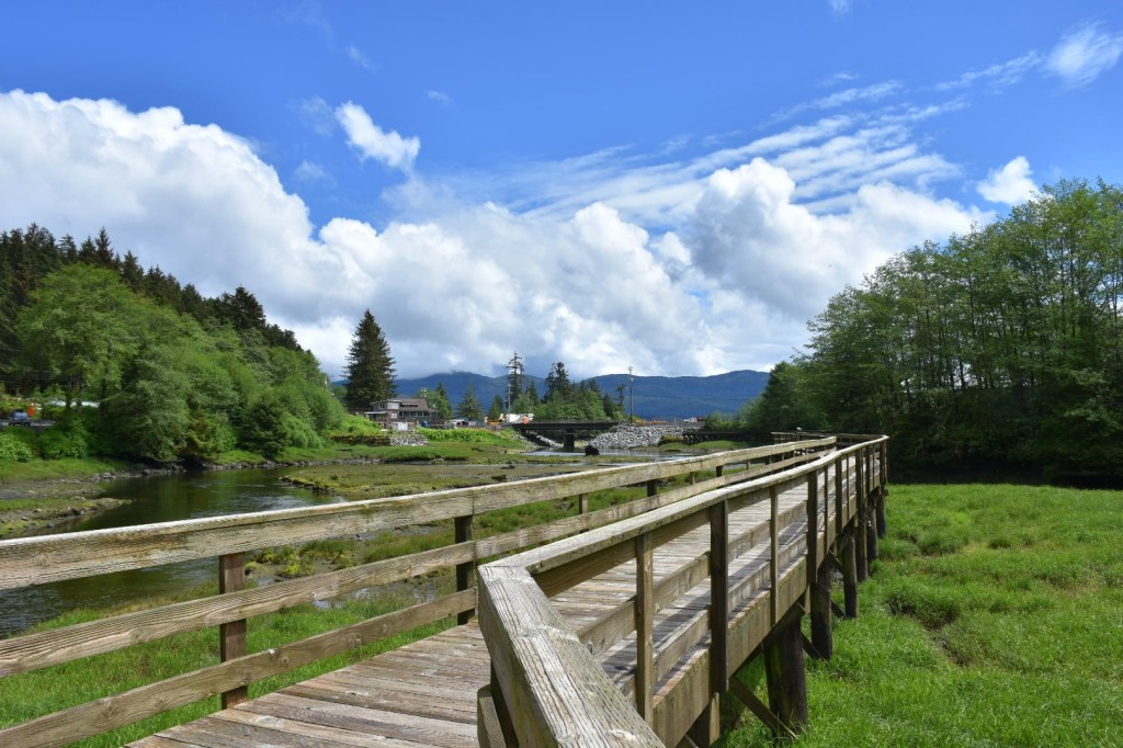 At the end was board walk where we could see a salmon hatchery. We learned the fishermen pay into the hatchery to make sure there is always salmon that they will be able to fish later. The hatchery will sell off egg or deposit the eggs in different locations for hatching. They do keep some to have hatch there, so they will have salmon that come back. The ones that hatch at the hatchery stay there for a year and then are released into the water to keep growing until it is time for them to lay eggs.