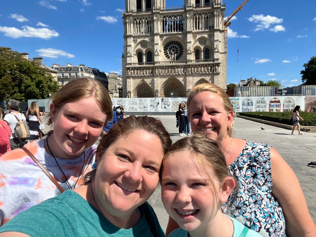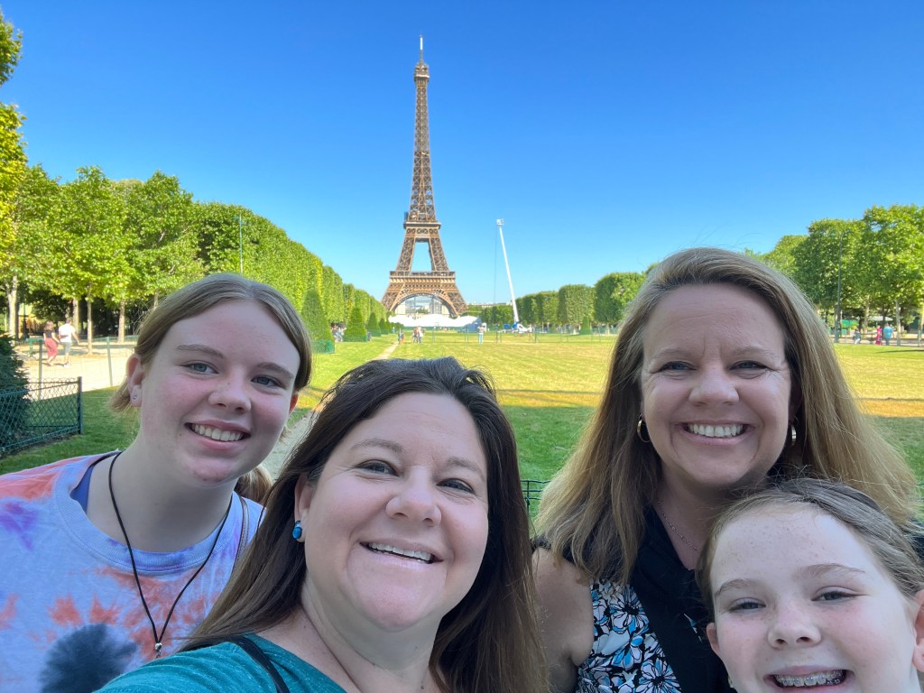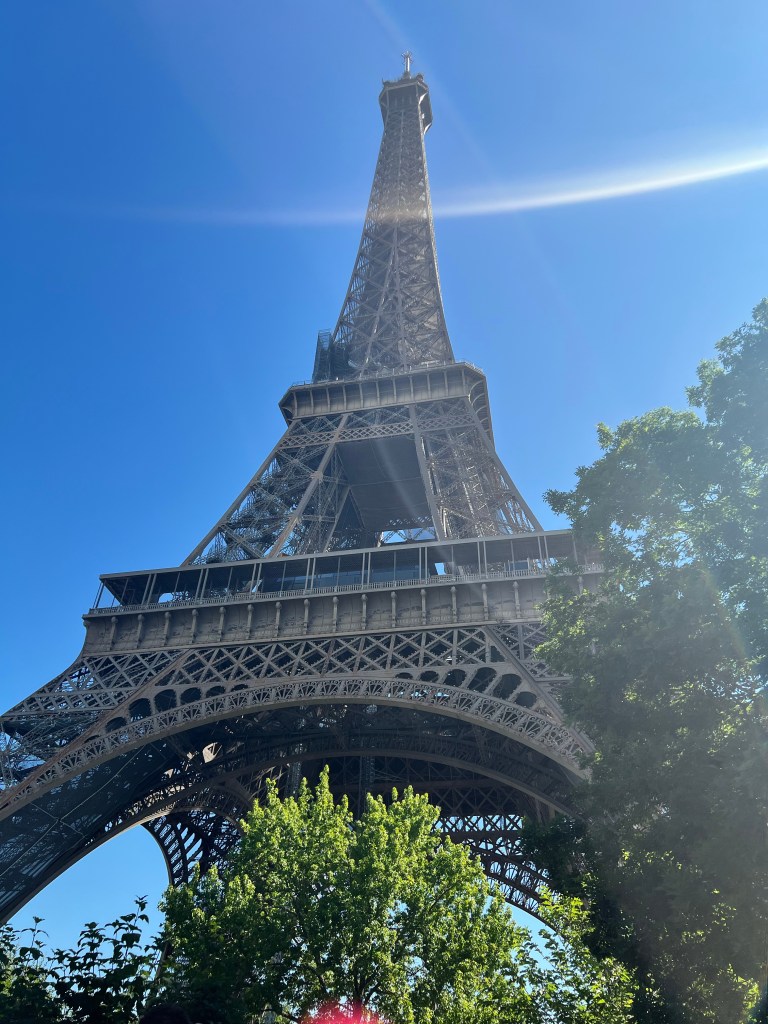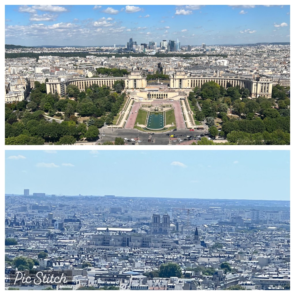 Finally we were in the correct area and started walking toward the Eiffel Tower. Since we waited so long we couldn’t buy tickets online and had to get in the super long line for people trying to get tickets to go up. We waited in line for at least 30 minutes to go to the ticket booth. Once there were found out we couldn’t go up to the top floor. From what we learned from someone else once they hit 1,000 people at the top they limit how many people can go up for a while and stop selling top floor tickets. Since we were already there we accepted going to the 2nd floor. We took the lift up and walked around. The Tower is in the process of getting new paint and being fixed up so you couldn’t make it all the way around. It was super busy and I’m glad we didn’t have to wait in another line to make it up to the top. We were able to get some good pictures and they weather was nice. In the low 70s the sun makes it a little hot.