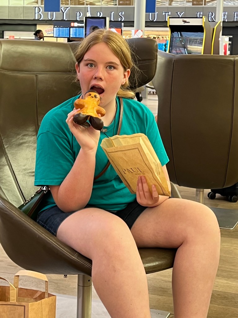 We were at terminal 2 and then once you arrive at the terminal there are more sections. So we had to go 2E to check in. On the way to the section of the terminal there were kiosks to do you baggage tags which was nice since there weren’t a lot of people. Then it was a little confusing when we got to the gate area. There were large groups of people and we were trying to figure out which line we needed to be in. I showed my ticket to a person at the line entry and since I was sky priority they sent us over to that line. Since kelle and the girls were standing with me they let us all go together even though they weren’t sky priority. We had to get in another line and get the security sticker. The man was very friendly and asked the girls questions about their trip to Paris. They were still a little sleepy since it was about 6:30 am. He told Jennah she needed to go get a cappuccino. Then we got in the line to drop off our bags. That was interesting. The baggage sorter wasn’t working so they scanned our bags and then we had to take them to a different area and drop them off and walk away.