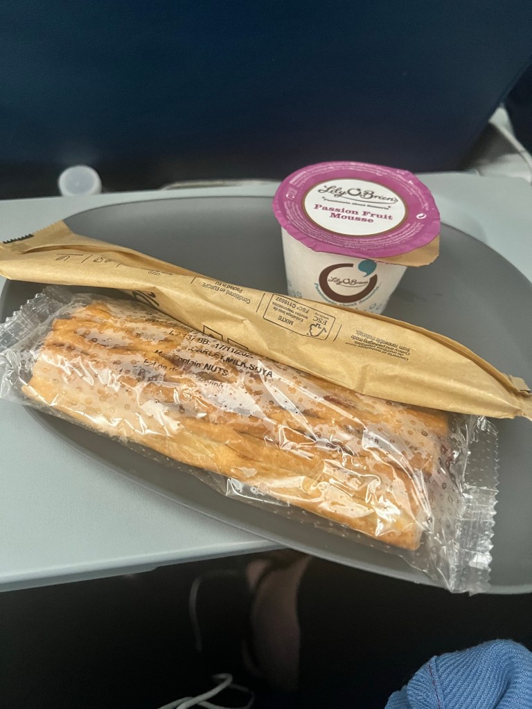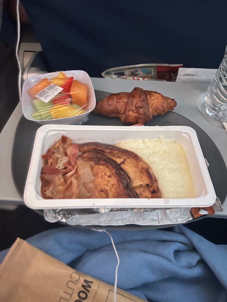 On the plane we were feed breakfast. The bacon was really under cooked and I did not eat that, the French toast wasn’t too bad.