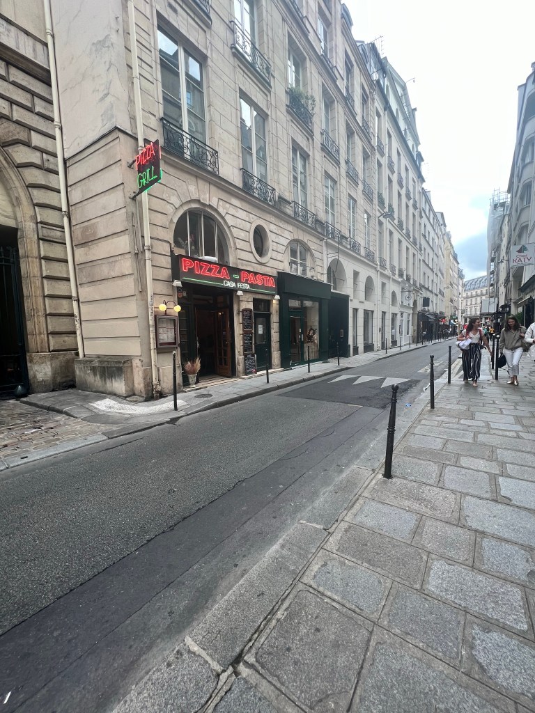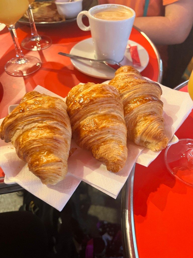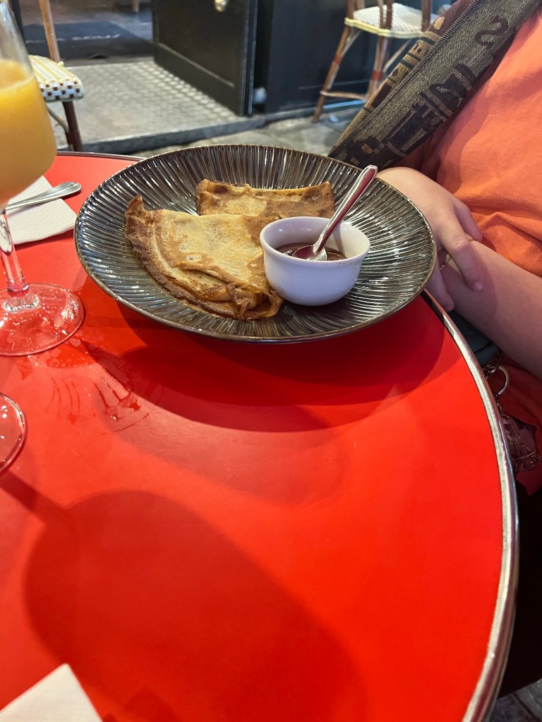 This morning we headed over to Aux Deux Ecus for breakfast. It was raining outside so we didn’t want to spend too much time walking around to find a place to eat. This place was only a couple minute walk from the Flat. We had the croissant, orange juice and cafe crème. This morning Kelle and I made sure to each our croissants like the French and dip it in our coffee. I will say it was delicious. We almost left this place because we thought you couldn’t get the crepes in the morning. So we got up to leave and the man came out and Kelle told him Jennah wanted Crepes. He was like oh yeah we do that in the morning not a problem. So she was happy and we stayed.