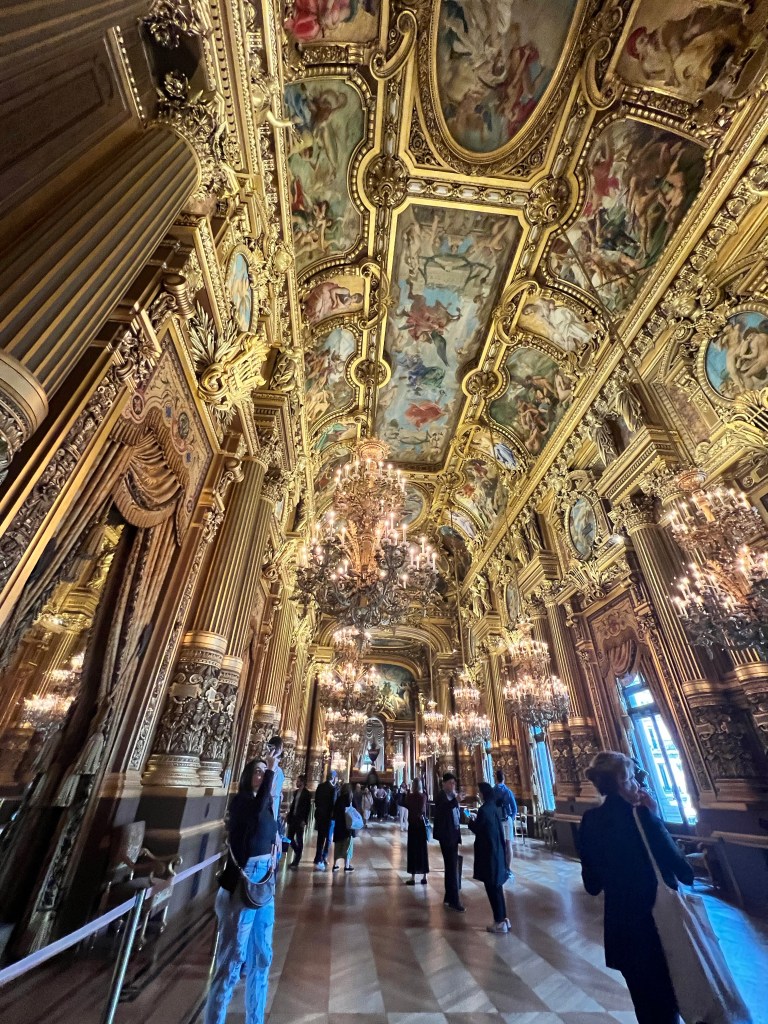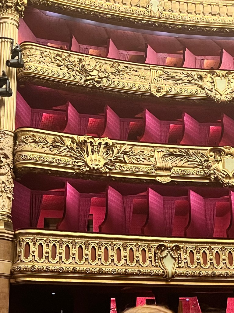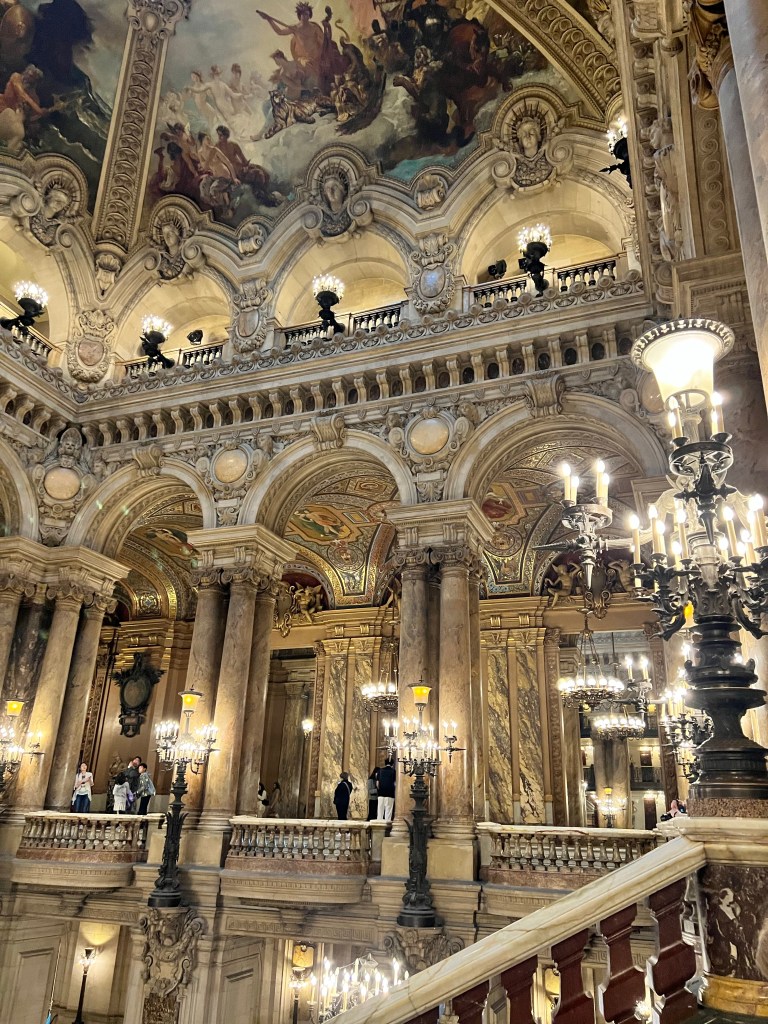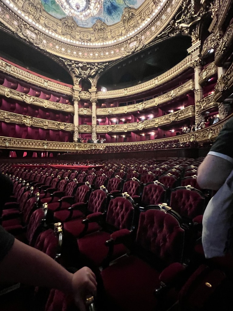 The Palais Garnier was the 13 opera house built at the request of Napoleon the 3rd. This was the place to be seen in Paris at the time. There was an amazing staircase to walk up and little balconies to stand at and watch people. There were 4 entrances into the Opera house. 1 for the emperor so his carriage could come right up to the door, 1 for season ticket holders, 1 for the common people, and 1 for the employees. So each side has an entrance with a purpose. The emperor and the empress’s boxes were facing each other and just next to the stage. So their boxes were great for people to see them, but not great for seeing the show. The stage also has a 5% slope to help people in the audience see. The book Phantom of the Opera was based in this opera house. They even have box 5 marked and sell a lot of phantom of the opera stuff in the gift shop. But since this is an opera house only operas and ballets are done here. They don’t don’t musicals, so phantom has never been preformed here. We did learn that all costumes and sets are done in house. Between this opera house and the “newer” one built in 1989 there are 1,700 people employed. From dancers, set designers, ticket sellers, light technicians. Tickets range from 120€-220€ depending on ballet vs opera. 12€ tickets for the very back of the boxes go on sale the day of the show.
