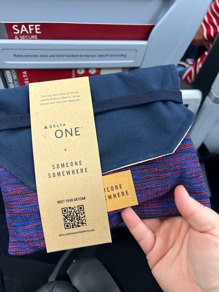 Getting on the plane was easy but then we were delayed because a panel needed to be changed. Luckily there was no one sitting next to me! The way the seats were made I couldn’t spread out, but at least I didn’t have to worry about leaning in someone’s space the entire time. I wasn’t in Delta One this trip, but I was in Premium, so we still got a nice toiletry item.