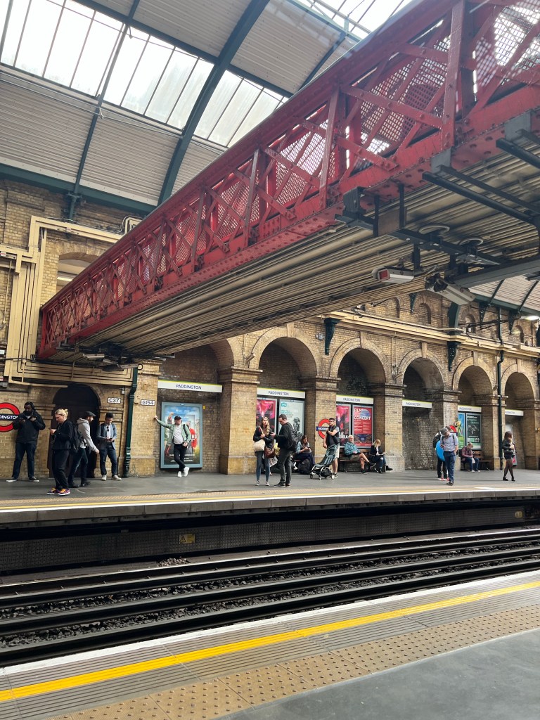 Then we headed down and decided to grab the Heathrow Express which goes directly to the Paddington station (15 minutes). Which by the time we made it to the train that one didn’t leave until 2:20. The Elizabeth line also goes to Paddington but make stops along the way (30 minutes). It may have take the same amount of time because the Elizabeth train left about 10 minutes before the Heathrow Express, but at least we didn’t have to worry about more people getting when we had all our stuff. There was a luggage cart, but from what I could see if was pretty full, so I had an open area where I stood with our stuff.