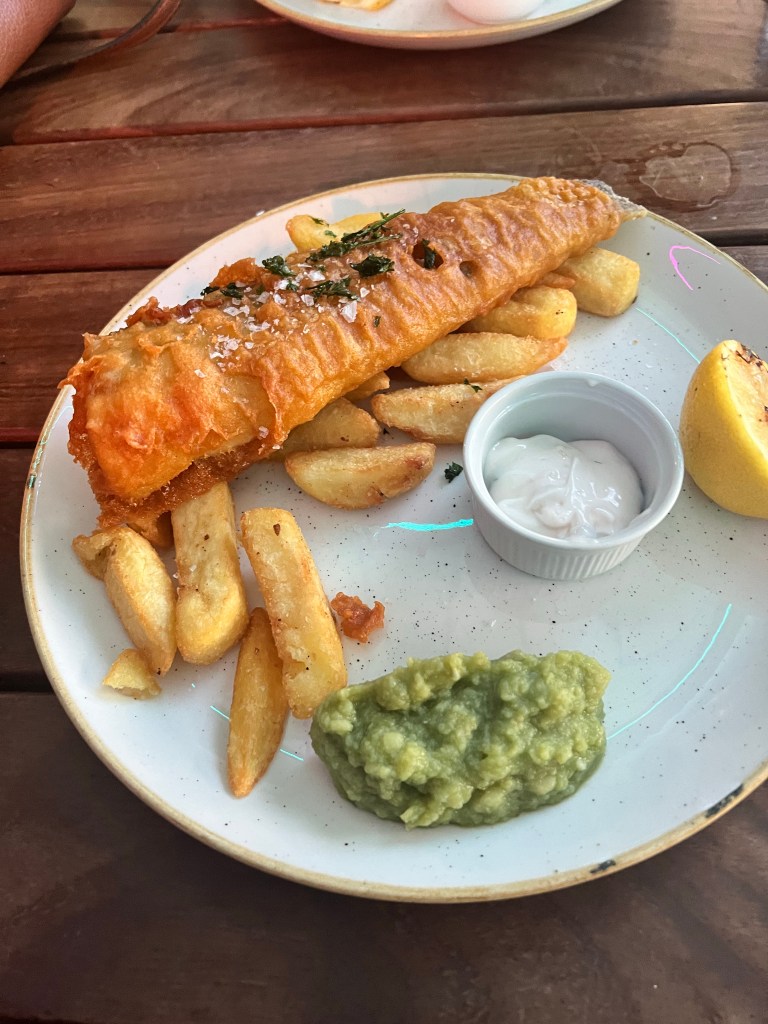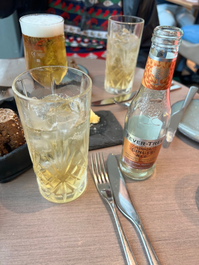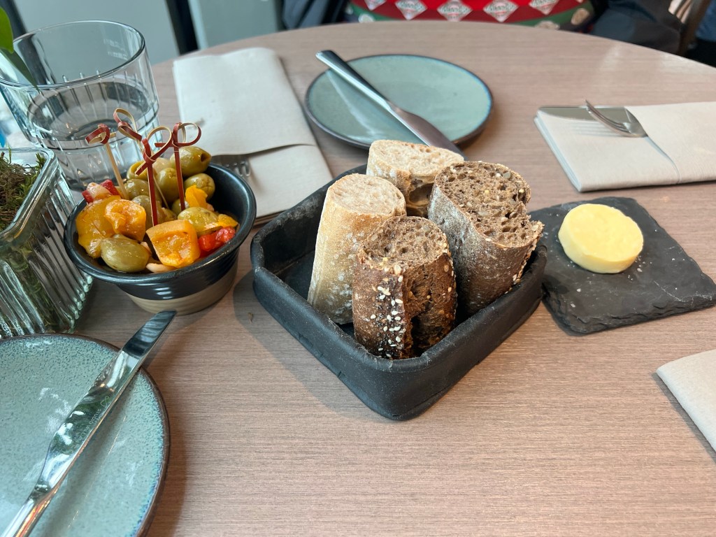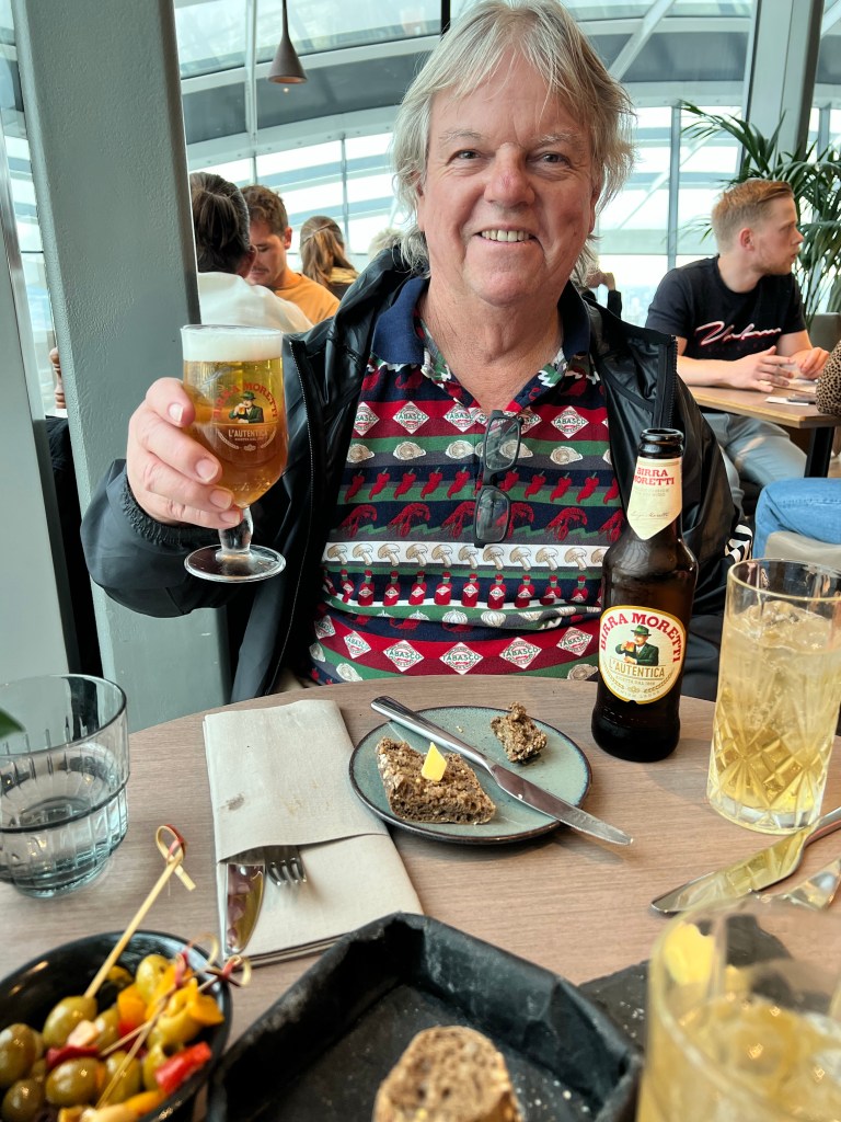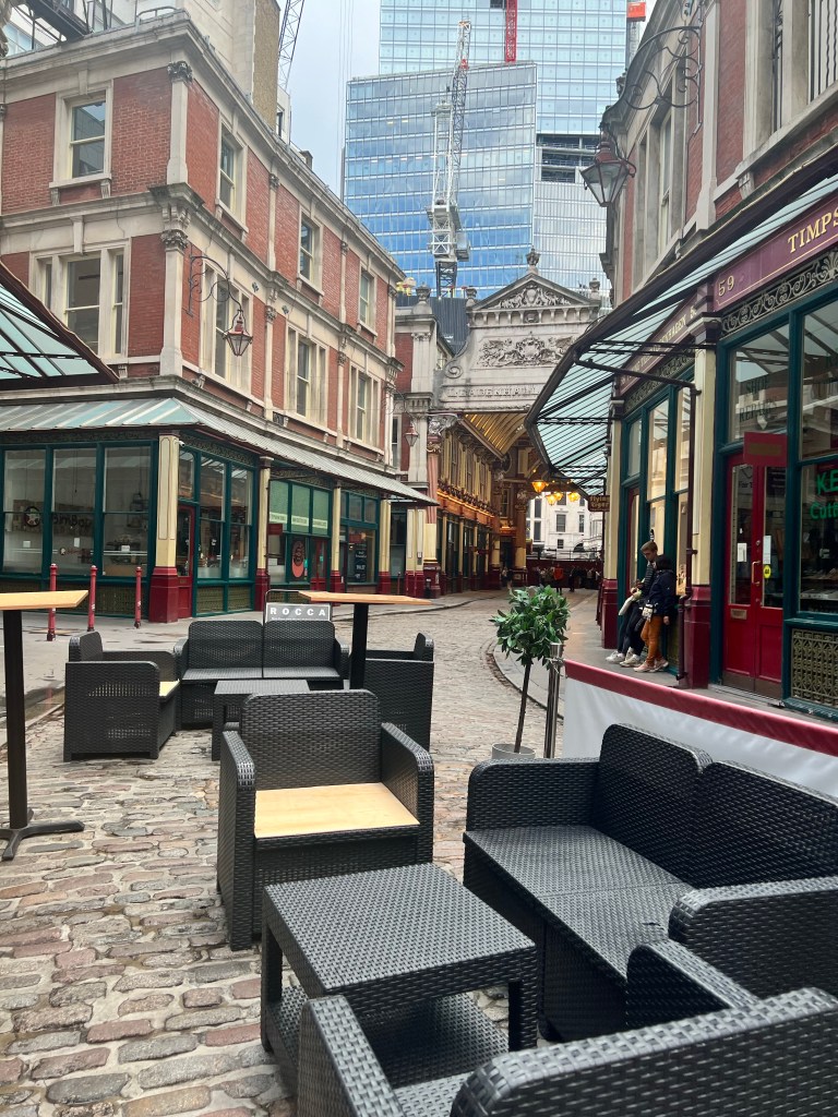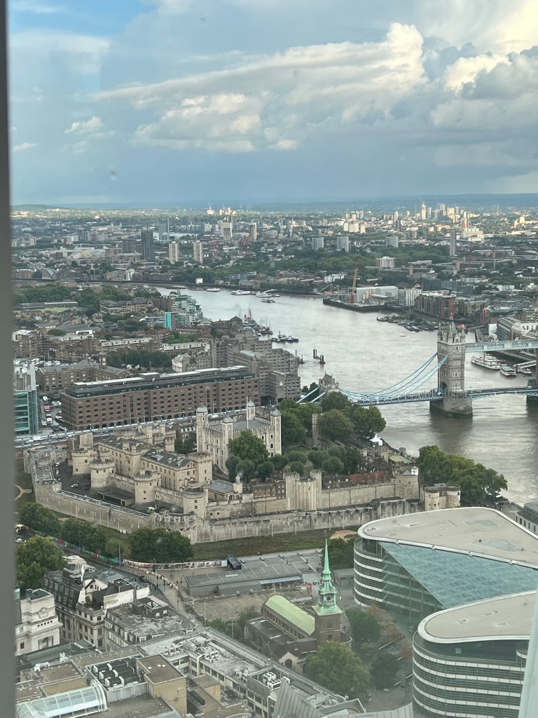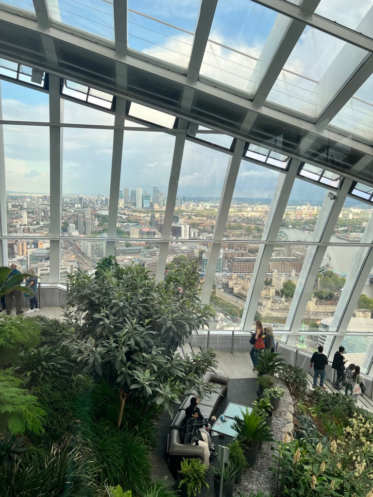 After dropping our stuff off and changing we decided to head out towards the Sky Garden. As soon as we got outside we turned right back around because you could see the rain coming down the street. So we grabbed our rain jackets and then headed out again. We walked to Sky Garden and checked out things along they. Way we got there it was a little confusing because there was a line but I knew I was supposed to check in at a desk before joining a line. Luckily we found the right desk and skipped the long out side line and took the elevator up to the 35th floor. Then had to find the other elevator to go up to the 36th floor. Finally we made it up to the correct floor and we seated. We decided to get a little snack since we hadn’t had any food since the bad plane breakfast.