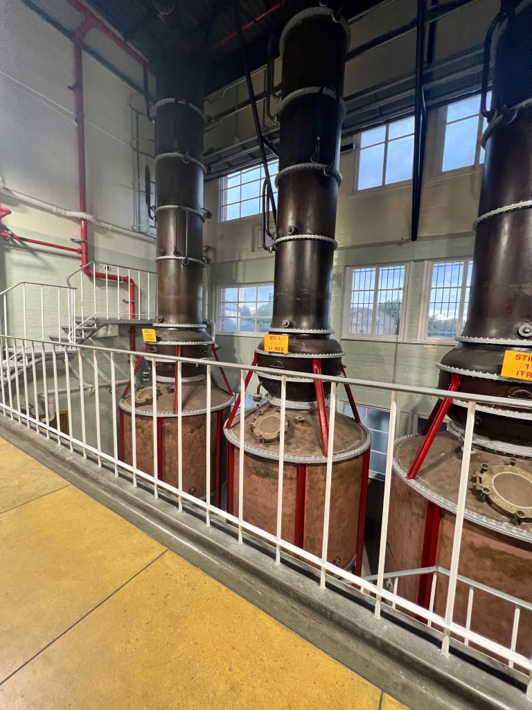 We walked across Vaux Haul Bridge to head to the other side of London. You can see the London Eye on the right and on the left past the tall glass building is the Queen Victoria Tower at Parliament. We decided to walk towards Lambeth Bridge and see the line of people waiting to get to Westminster Abbey to see the Queen’s coffin. The line was about 14 hours long and constantly moving, so it was a long line. I thought this fish light pole was cool. As we walked along the River Thames we were able to get better views Victoria Tower, Parliament and Big Ben (AKA Elizabeth’s Tower). These people we in line to cross the bridge to continue to make their way to Westminster Abbey. From here it is still about a half mile away from the Abbey. We stopped at the The Rose on Albert Embankment to have a drink and watch all these workers standing around. Since the funeral is tomorrow we know they will start closing down streets and getting things prepared. It is about 4pm currently on Sunday. The Queen’s funeral starts at noon on Monday. After we finished out drinks we headed over to Beefeaters Gin to hang out until our tour started. The first part of the tour is self guided, so we were let in 1 party at a time based on when you arrived. We went though reading about the history of gin. Then the end was about where the juniper from for the Gin and Ads for different counties. Once everyone had made it through we were given about 30 minutes to go through. We were taking up stairs to the tasting room.