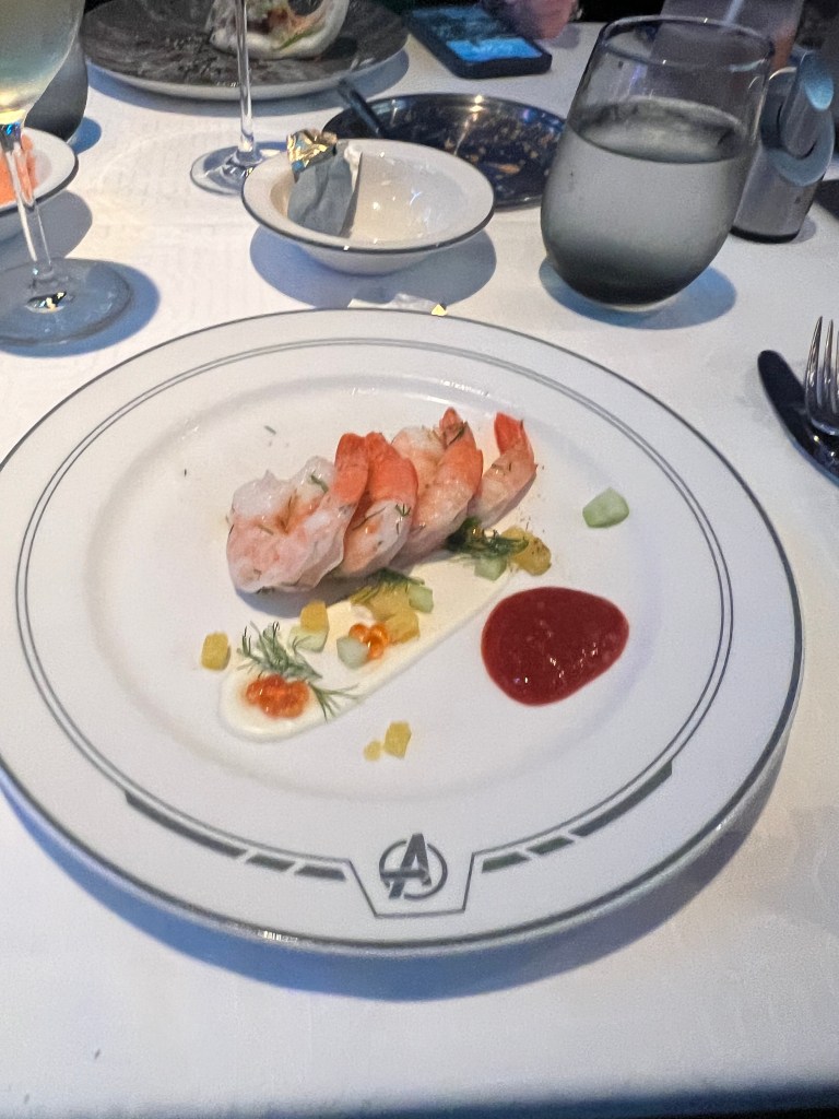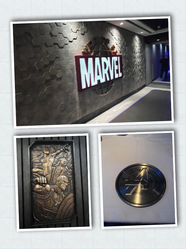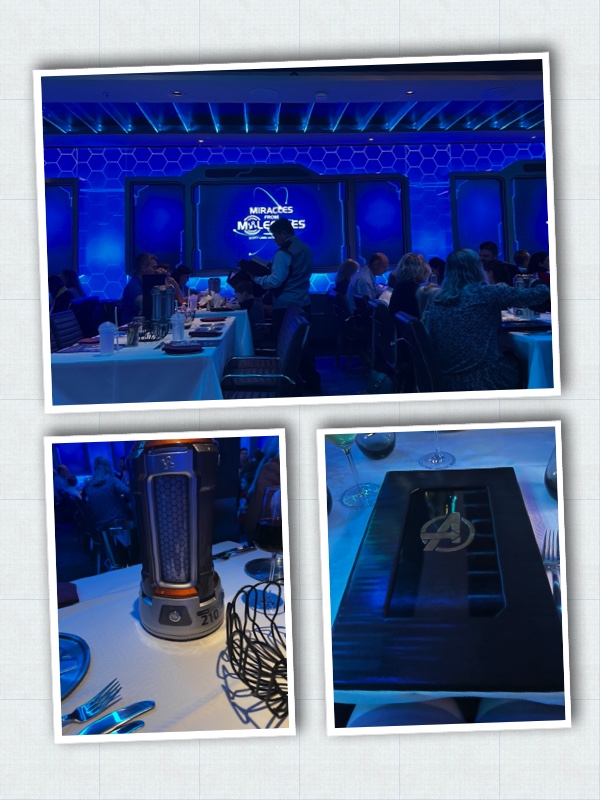 Dinner the first night was at World of Marvel. There were some cool decorations around the restaurant. They also had a show on the TVs with the Marvel characters which was interactive with the things at the table. The show was the Avengers: Quantum Encounter. It kept things moving during dinner which was great. There were quantum cores on the table that would light up and you got to push the buttons as part of the show.