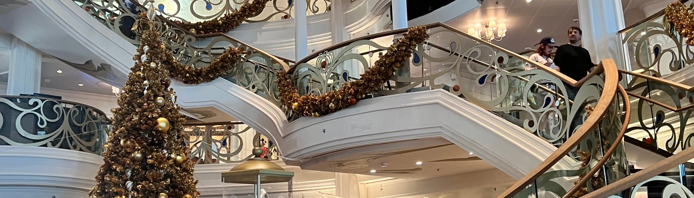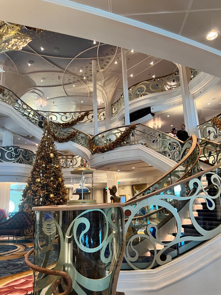 Finally made it on the ship and right into the main area. We took some time to walk around just a little bit for deciding to go to the sit down lunch at 1923. There were a lot of cool Christmas decorations to see. I thought the entrance was very pretty. not having the elevators at mid-ship really opened things up in my opinion.