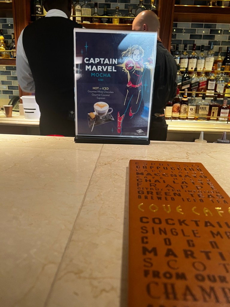 Woke up around 7am and decided to head up to Cabanas for breakfast. First we stopped at Cove and got a coffee. They had a Captain Marvel it was a white chelate mocha with coconut. I got a vanilla latte with the Black Panther stencil on top.