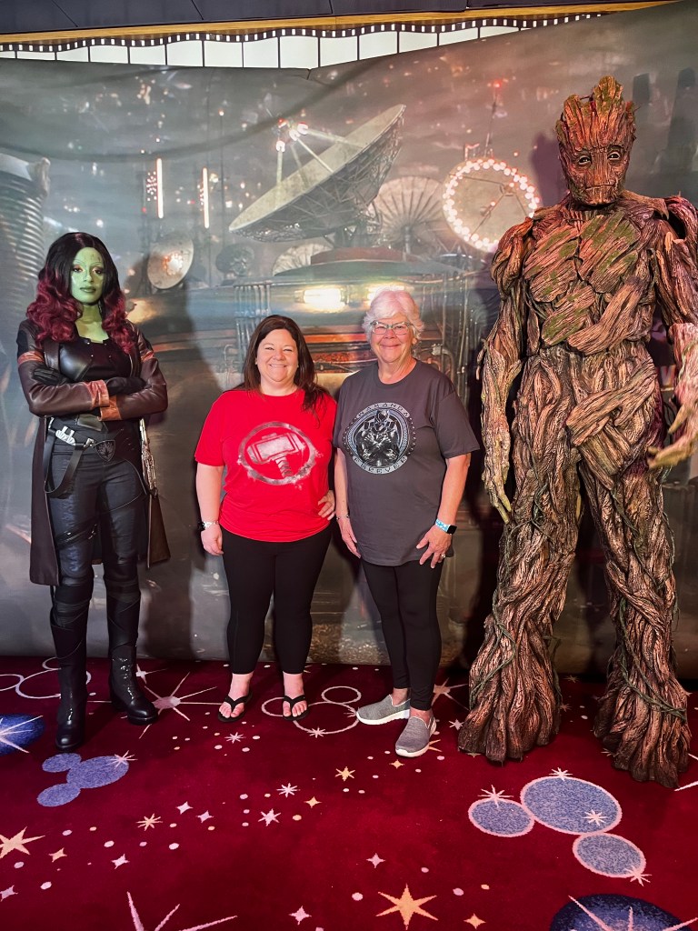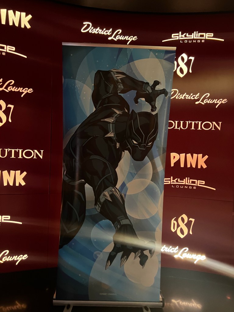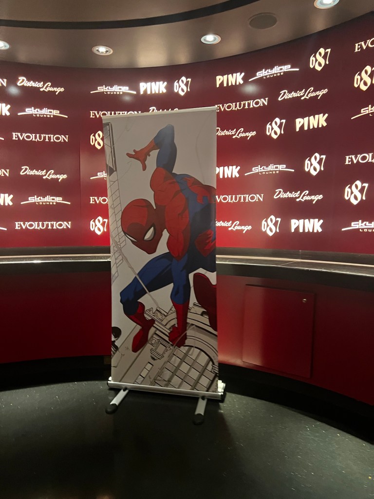 Then we headed over to the Buena Vista Theater to watch a 30 minute show about the Origins of Marvel. It talked about the original Publishing company back in 1939 to the 1940s when a 19 year old Stan Lee bought the publishing company and it became Atlas comics. Later it became Marvel Comics with Stan Lee working with different illustrators to create the Marvel Universe. The program talked about a few Marvel Characters, the movies, hotel in Paris and different parks around the world that has some rides. After that was over we stopped and talked to Dominique who was hosting the event. She was on our Dream cruise last February 2022 hosting one of the trivia games.
