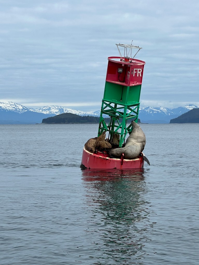 When we got on the bus we learned, we were going to go out looking for whales first, and then do the hike afterwards. There are only 15 people in our group. We were on a nice small boat and headed out into the water. The Captain said we were going to an area near the Juneau lighthouse. We saw a buoy with a giant Stellar Sea Lion.
