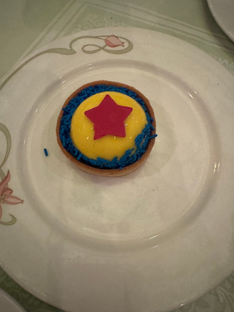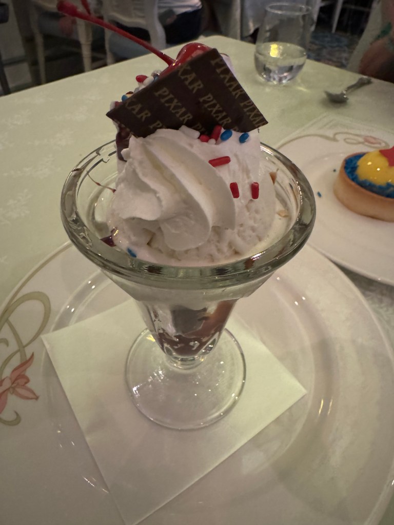 Dinner tonight was back at Enchanted Garden for a Pixar themed dinner. I started with Russell’s baked shrimp Mac and cheese. Then I had Sanjay’s murgh makhani-butter chicken. Since it was Pixar night we got the specialty dessert the playful Pixar ball and the Pixar Chocolate Fudge Sundae.
