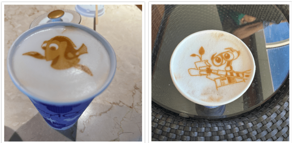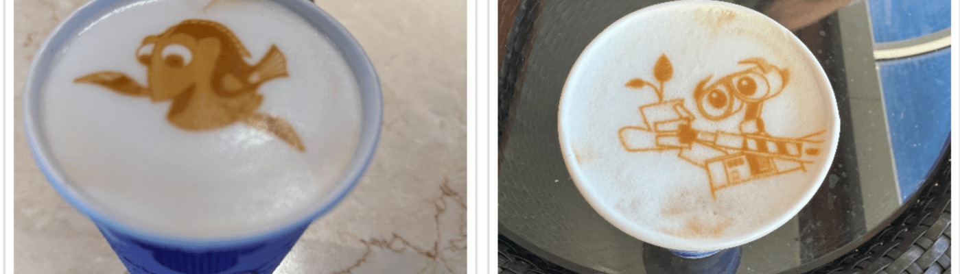 Time changed an hour ahead which of course meant we woke up at 6am with the sun shinning into the room. 6:40am we decided to go up to Cove for coffee. Seems that was the same idea everyone else had too. It was packed up there and tons of people were out saying beach chairs by the pool. Right next to the signs that said don’t save chairs for long periods of time! We did hear a lot of people complain and saying that haven’t had this problem before. We found chairs easily in the adults area, but of course we weren’t really looking for lounge chairs. Since it is Pixar Day we got fun little decorations on our coffee.