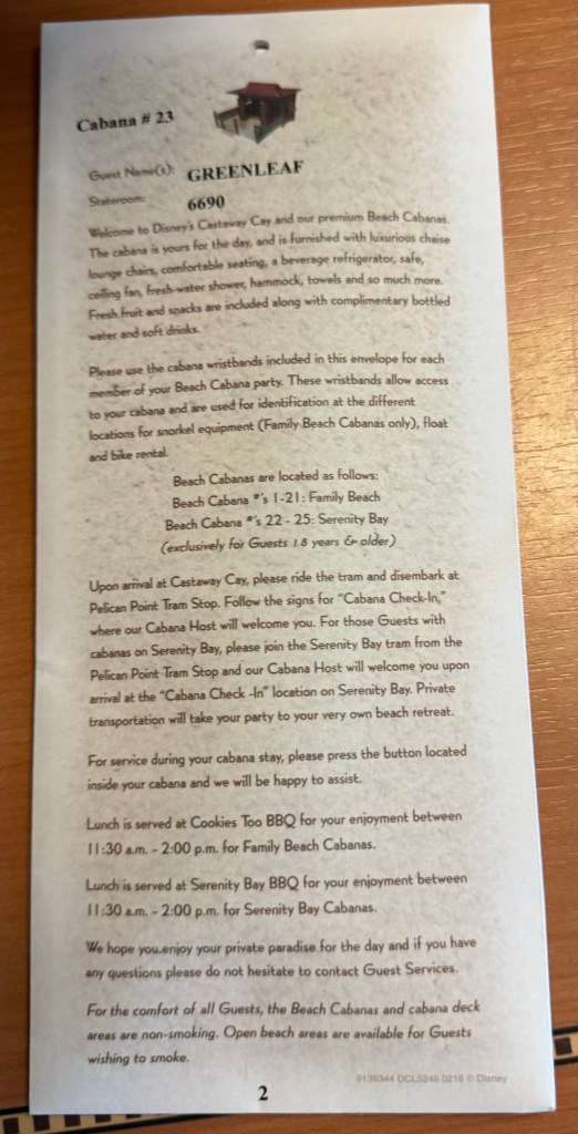 It was cool to watch the ship back into port and see everyone on the island getting ready. You could also see the rain coming across the island which is really cool. We got our things ready for our Serenity Bay Cabana. The night before we had an envelope dropped off with all the Cabana 23 information and our wrist bands.