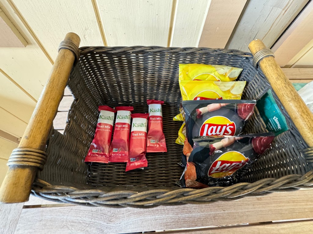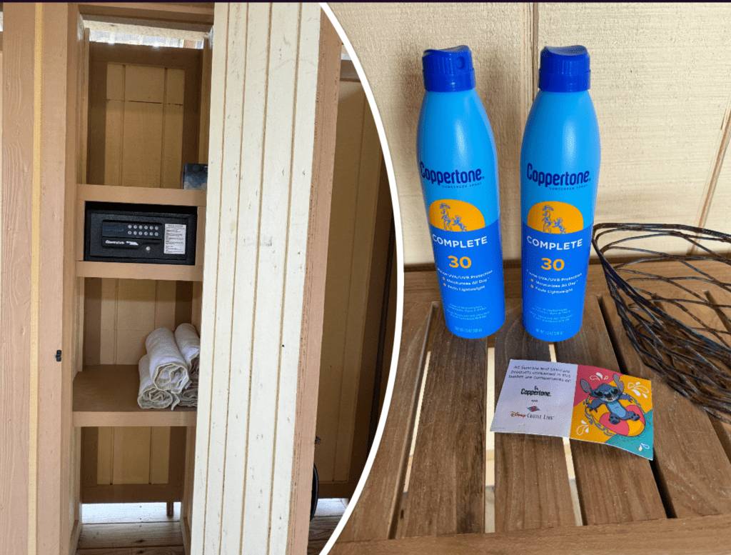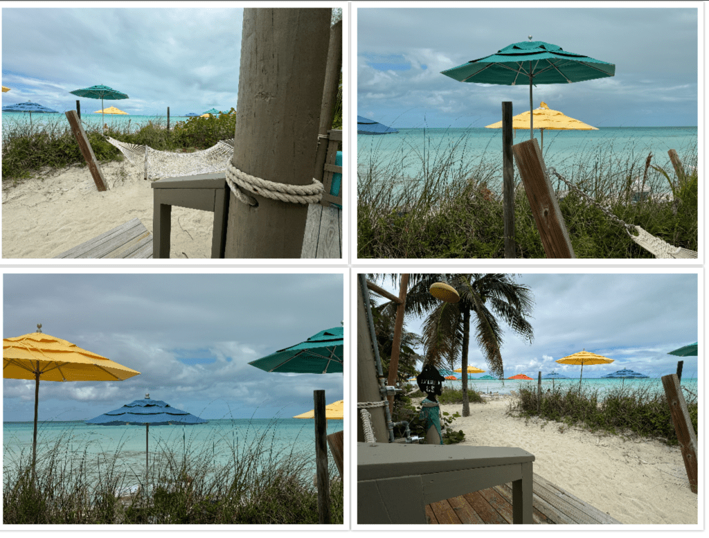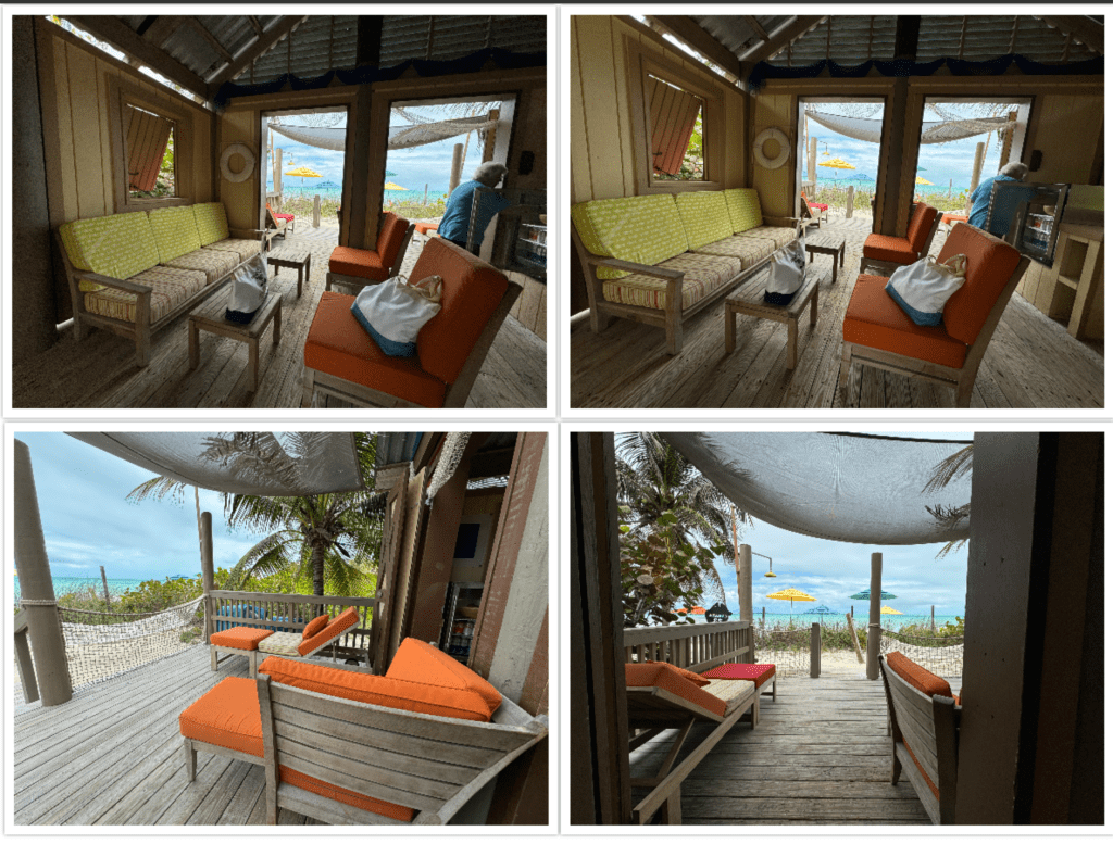 We were in Cabana 23. The adult cabanas are 22-27. Inside the cabana is a little screen for changing. Not the best as I could see through the little holes in the screen and when the wind blew it opened it a little. Next time I’d change before coming down it was a little tricky. There was a closet with a safe, tissues and shelves to store things. A little table with spay sunscreen. A basket full of towels to use and a basket of chips and granola bars. The fridge held a large bowl of fresh fruit, coke, Diet Coke, sprite, Sprite Zero and water. Inside the cabana were ceiling fans, a couch, coffee table and 2 chairs. On the back deck were 2 lounge chairs and a chaise lounge. Then a hammock in the sand, a long with 3 tubes and 3 rafts. There was also a shower and foot rinse station. These cabanas are the closest to the beach where the other down the beach look like they are set back just a little farther.