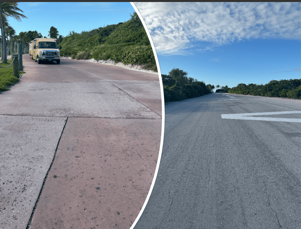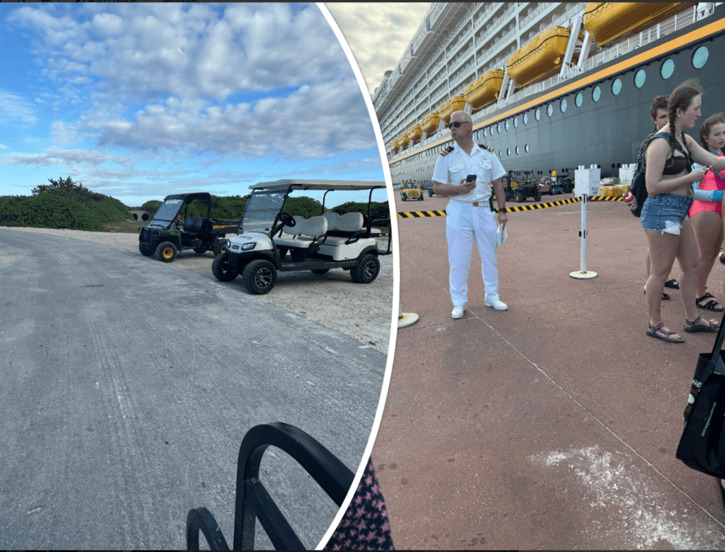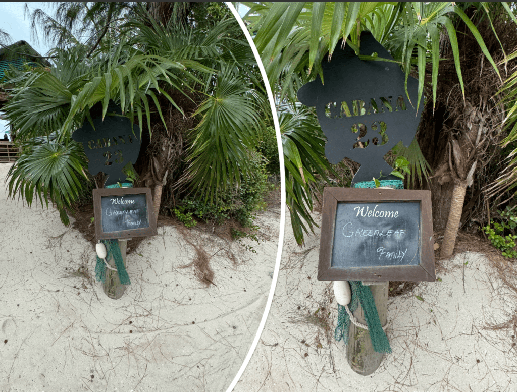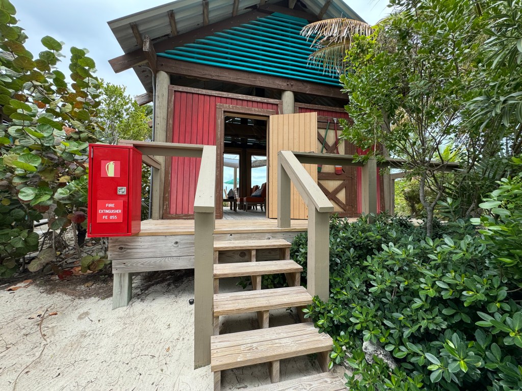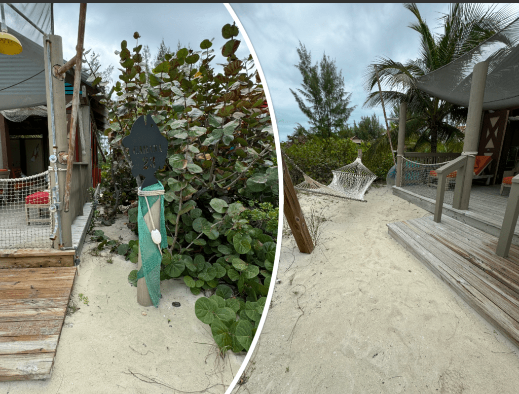 We got off the ship and walked down to Pelican Point team stopped to catch the team to Serenity Bay. Once we arrived at Serenity Bay there was a Cabana sign to the left of the plane with an employee waiting in a golf cart for us to arrive. Once he checked us off his list we hopped into the golf cart and were taken to our Cabana.