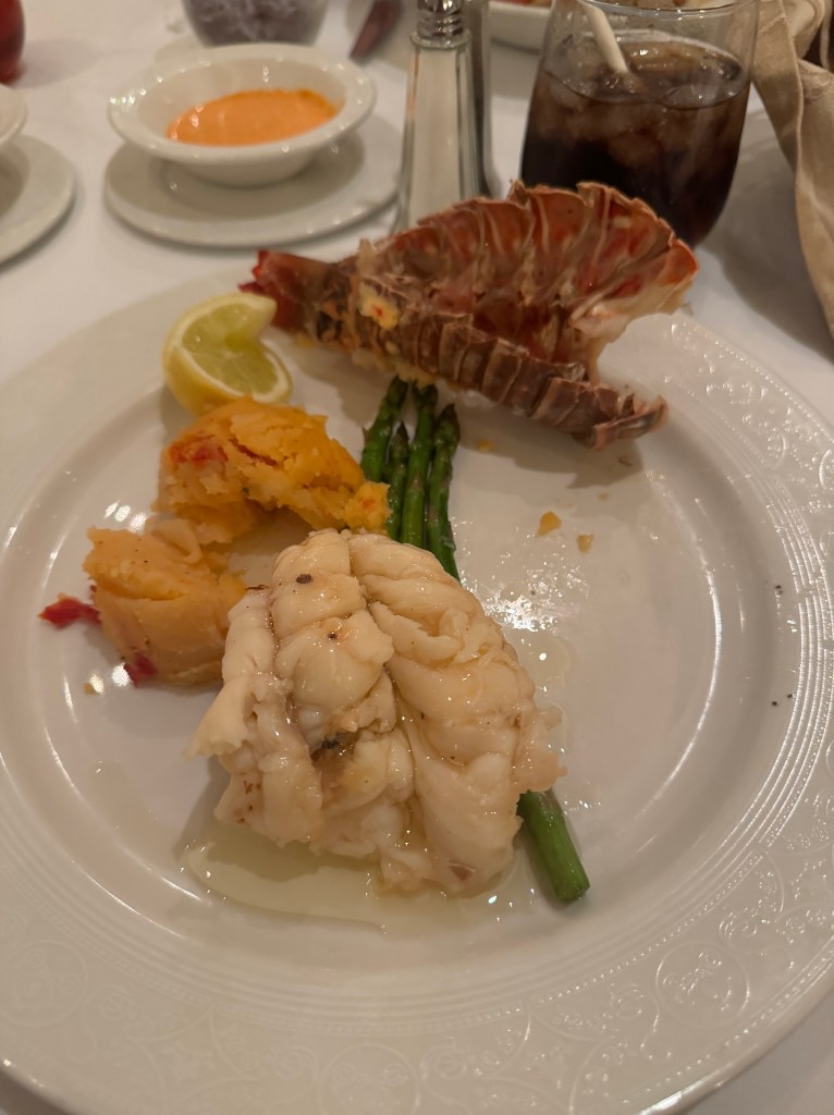 Dinner tonight was back at Royal Court. I had a salad, Lobster tail (always fun to have someone else come and take it out of the tail), a sundae. After dinner time is always get things packed and suitcases put out before 10:30pm. Then complete the survey to turn it in.