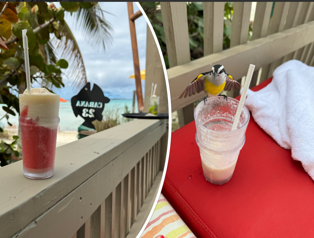 There were plenty of bar staff walking around and we easily got a bon voyage (pina coloda and strawberry daiquiri). He came right up to the Cabana got our room card and brought our drinks right back. It was very relaxing. I had a bird friend I was competing with when it came to drinking my drink. Luckily I finished it before he was able to get some.