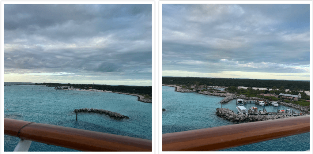 A quick breakfast over at Cabanas before going back to hang out until we arrived at Castaway. We were supposed to disembark at 10am, but we were just pulling into Castaway at that time. When ended up getting off of the ship about 11:15. The all aboard time was pushed from 4:45 to 5:40pm. It was a little rainy while we were pulling into port. Nothing that would keep you off the beach or from being able to pull into port.