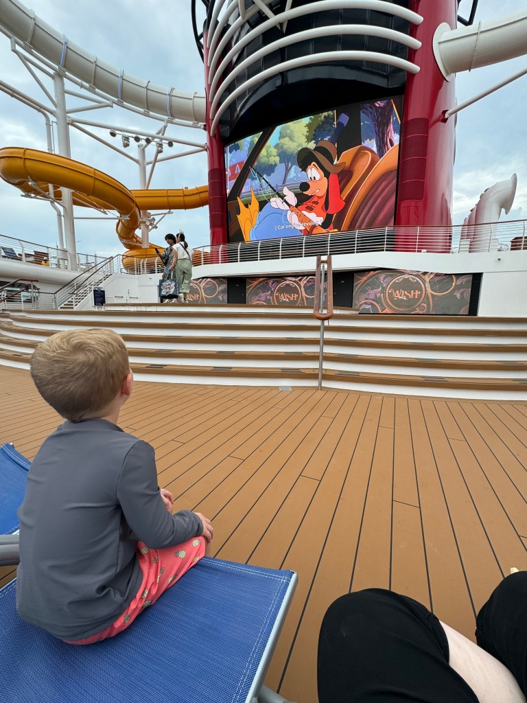 Our room was on deck 11 which was very convenient since that is where the pools and food were. We were able to unpack our luggage and get ready for the drill. Our drill location was on deck 4 in the Walt Disney Theater. Not having to wait outside with the boys was really really nice. George was in crazy mode during the drill so it was good he could be on the floor or in a seat. He hadn’t gotten a nap, so was running on pure crazy.