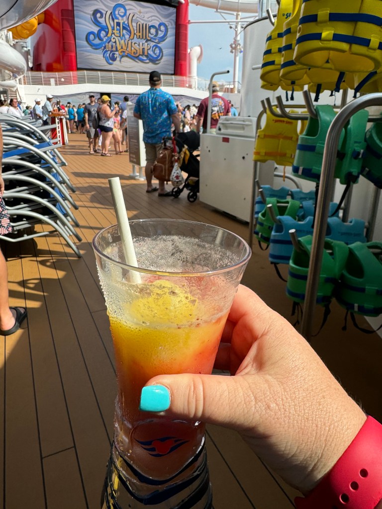 After the drill getting back to deck 11 was crazy there were so many people waiting for the elevators and stairs. The stairs give you a good work up going up from Deck 4. Once we made it up stairs it was time to head for the sail away party. We grabbed some drinks of the day in souvenir cups and watched the show. It was super hot and sunny out, so we did our best to find a spot in the shade during sail away.