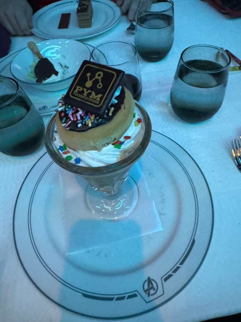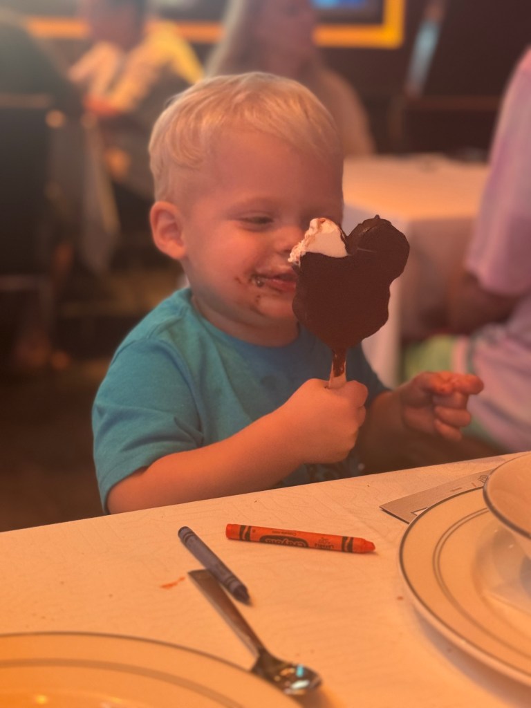 Dessert was the winner of the night. G had a red velvet cupcake I think he only at the frosting. G2 has a mickey ice cream bar.