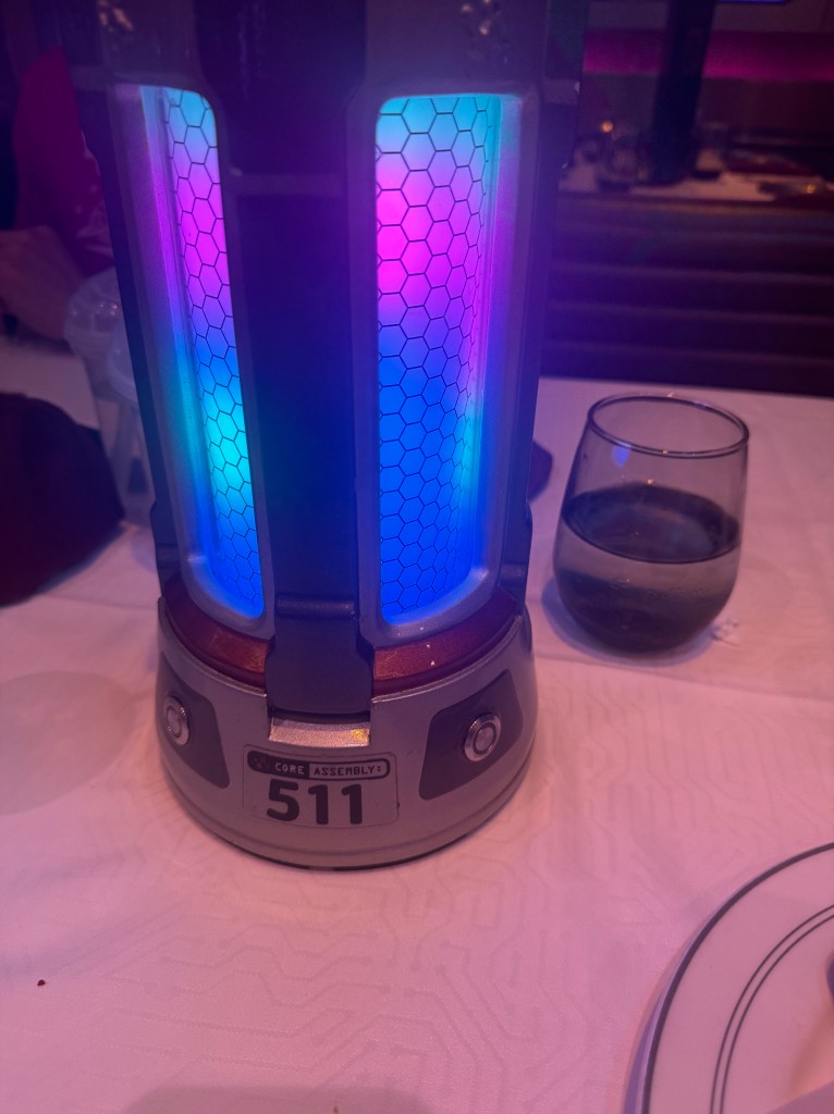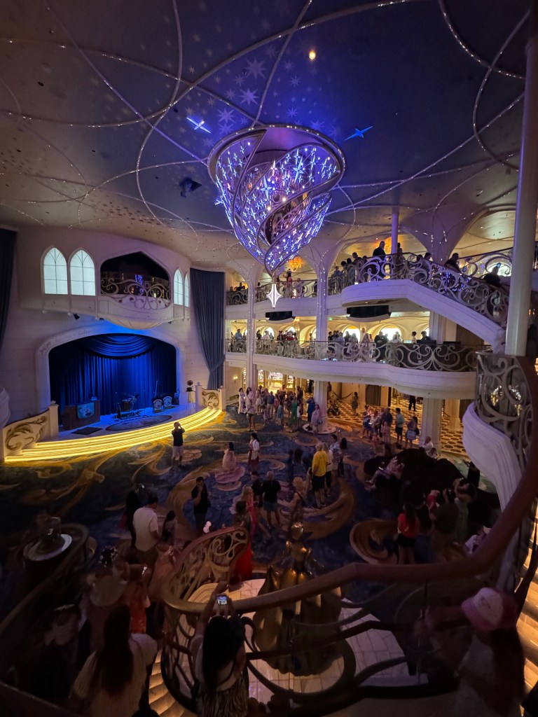 We tried walking into the shops after dinner, but it was so busy we ended up in a check out line and we were just trying to walk around. So we decided to skip that for now and go check out more parts of the ship. The atrium is really cool and they change the lights with the music which draws the crowds.