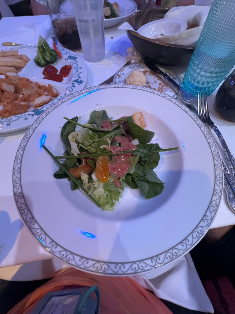 Dinner tonight was at Arendelle. There is a really long hallway with tons of decorations around that make you feel like you are in a castle hallway.