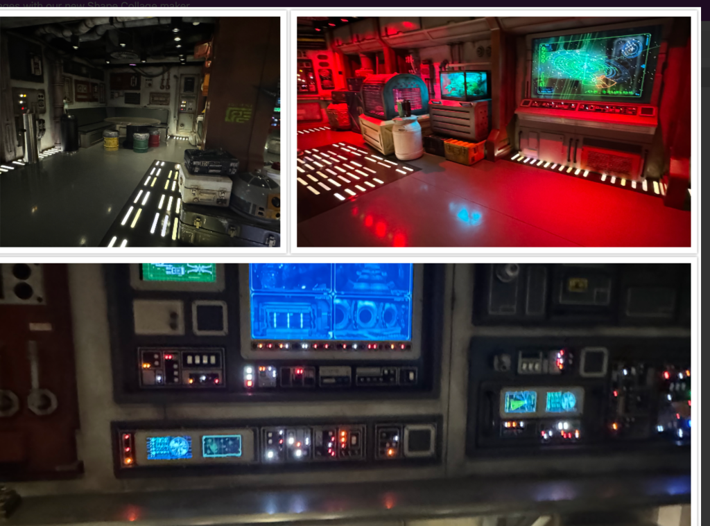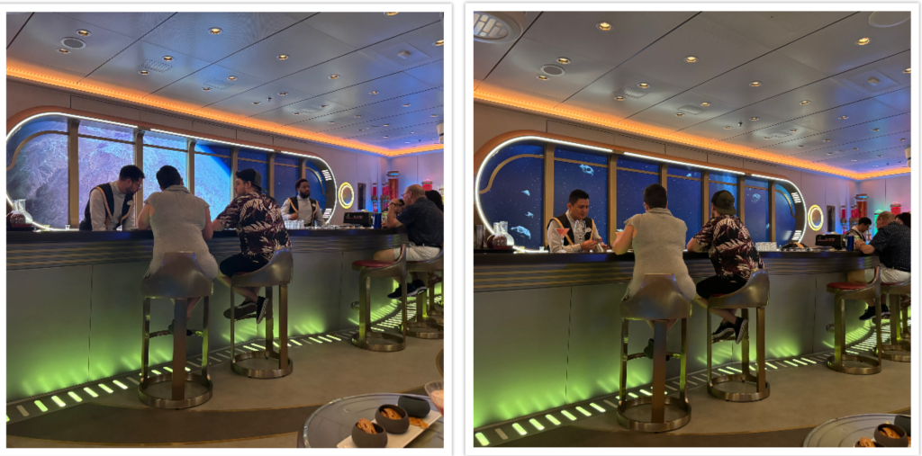 Every 7 minutes the screen behind the bar would into “hyper speed” and change to a new planet. The magic bands we wore were really active with the different ships showing up on the screen in the different planets.
