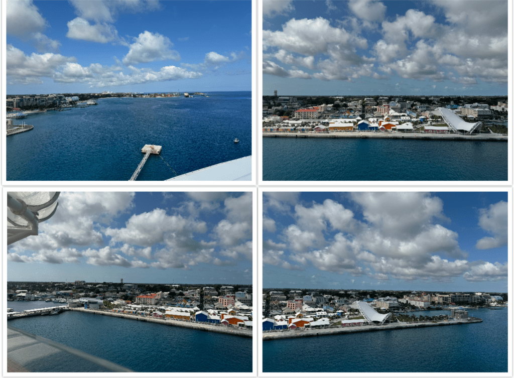 Headed back up to Deck 11 to watch as we came into Nassau. There were at least 3 cruise ships on the other side, but this side had a nice view of the port. The market area in the port has been redone and has some nice colorful buildings for the vendor shops. The weird looking silver covering on the bottom right of the top right picture was a huge grass area. Looks like an out door amphitheater.