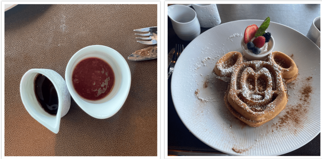The food was done in an order this time. Our waitress asked is we wanted to order a pizza which we did. Then she came back once we had the pizza to ask us what else we wanted to eat. We decided to do half Margherita and half sun dried tomato and goat cheese. Both sides were very yummy and it was the perfect size for 4 people. So I then went to back ordering a breakfast item to get my strawberry Waffles. These are much large then you get at the buffet and so much better. I can never finish the entire thing since there are so many good choices!