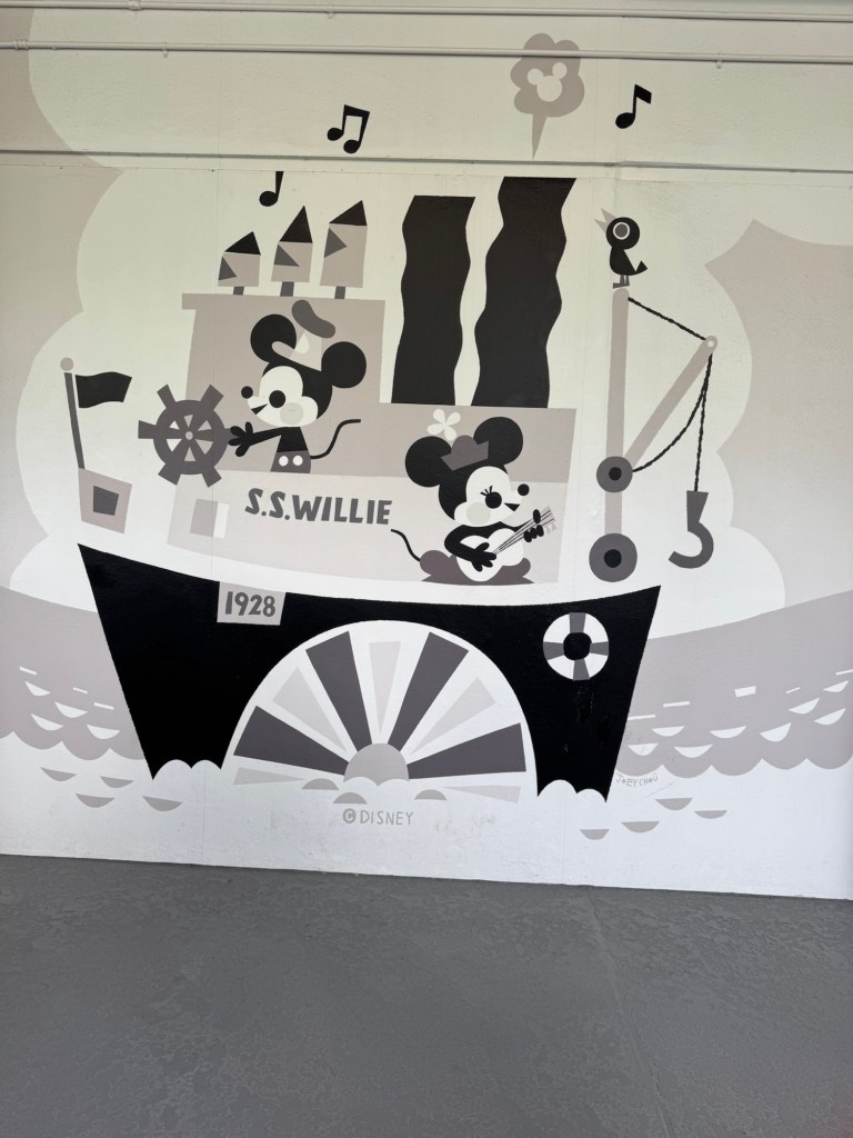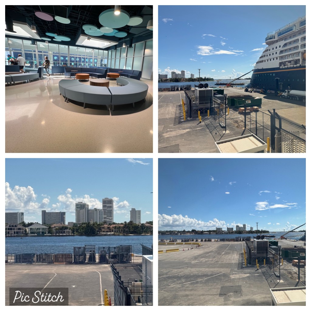Drove down yesterday to Fort Lauderdale and stayed at the Hyatt place. There was a nice little area with some restaurants and Publix really close to the hotel. This morning we had breakfast at the hotel and the walked over to Publix which had a Starbucks. Then we went back and hung out in the room for a little bit. The hotel was about 10 min from the port. We were parked and in line for concierge by 10:30am. No wait to drop off our bags and easily found parking. Then found the line for concierge. We manage to get the one spot that didn’t have a fan blowing. There was some cute Disney art work we people walked towards the port.