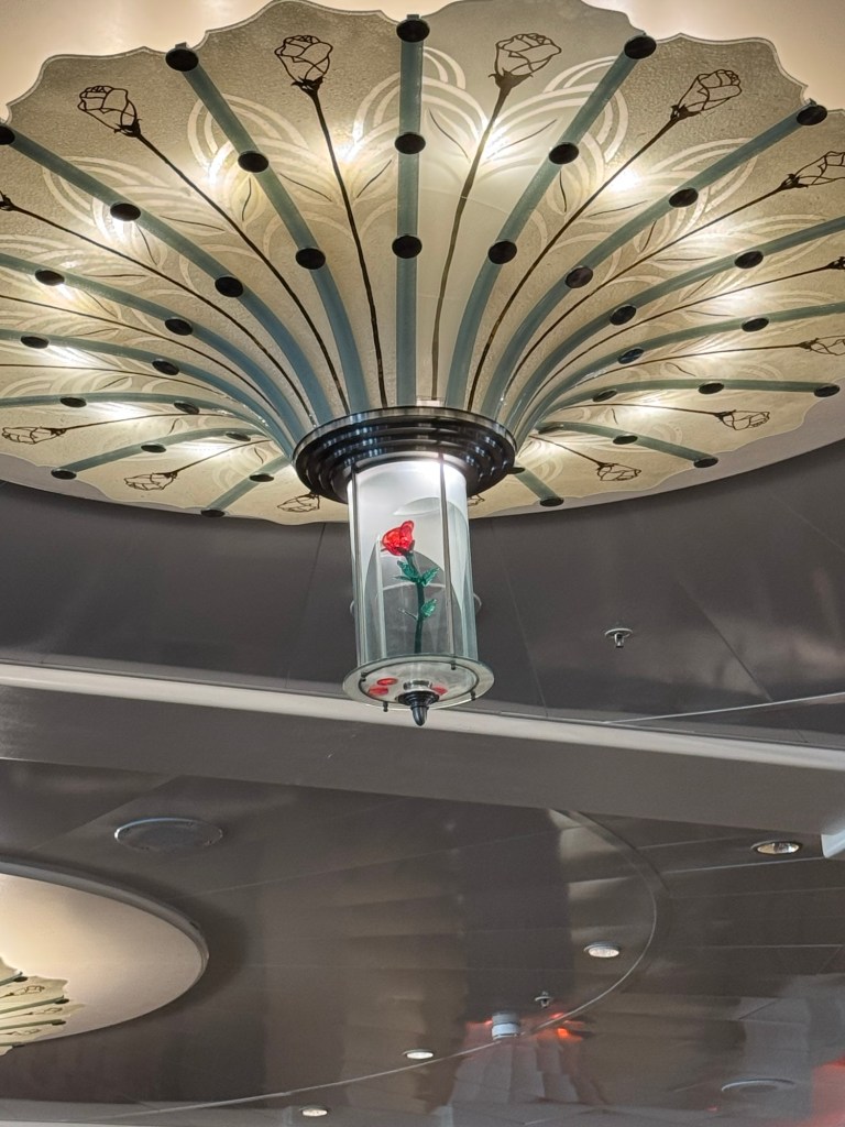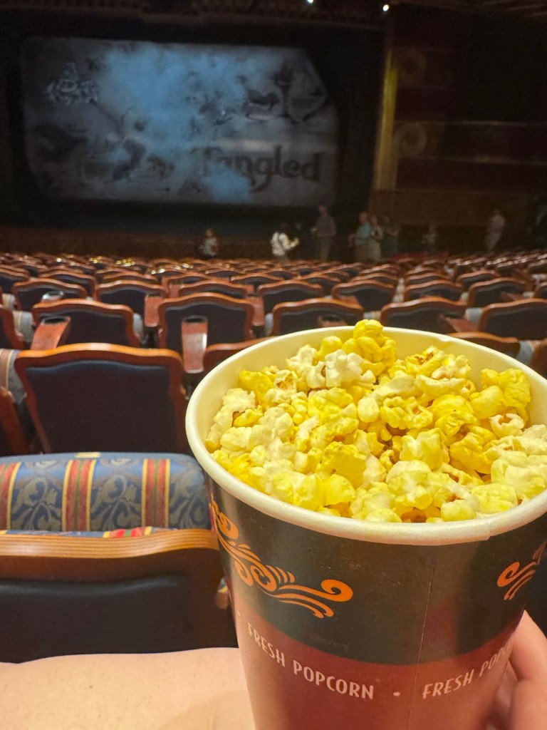 Next stop deck 3 to o’gills to wait in the lounge for the concierge special early seating. Kenan one of the host saw us and directed us to was toward the open door in the bar. We saw another host who had a tray full of waters and popcorns that we got before walking in the side entrance to the theater. This side entrance was used a lot during the show to get the cast from the floor of the auditorium back to the stage. We were the first concierge people in the theater to pick out seats. The show tonight was Tangled. They did have a moment of technical problems but it was fixed quickly.