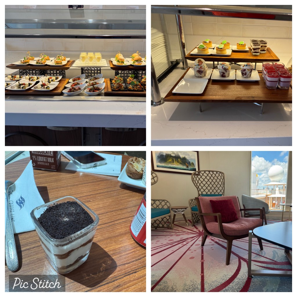 We relaxed for a little bit before heading up to the concierge lounge to see what snacks were available. We sat down in the lounge and had a little snack. We checked the outdoor lounge area too before walking around on decks 9 and 10. They have different snacks out during the day. I had a tiramisu and we enjoyed a spot inside by the window. There are tons of drinks as well to grab from the fridge anytime we need.
