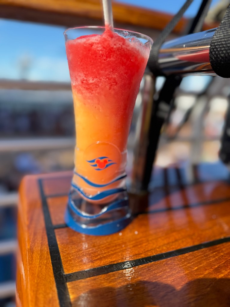 After we walked around some we went back to the room to unpack and get ready for the muster drill. Our muster station was in the Walt Disney theater. After the business was finished we headed up to deck 10 to get ready for the sail away party. After being on the Wish it makes you realize how small the magic is compared to the new ships. There were also tons of kids on this cruise. We grabbed the drink of the day in a souvenir cup. It tasted for sure the top part was a strawberry daiquiri and maybe the bottom was more pineapple like. It was really good.