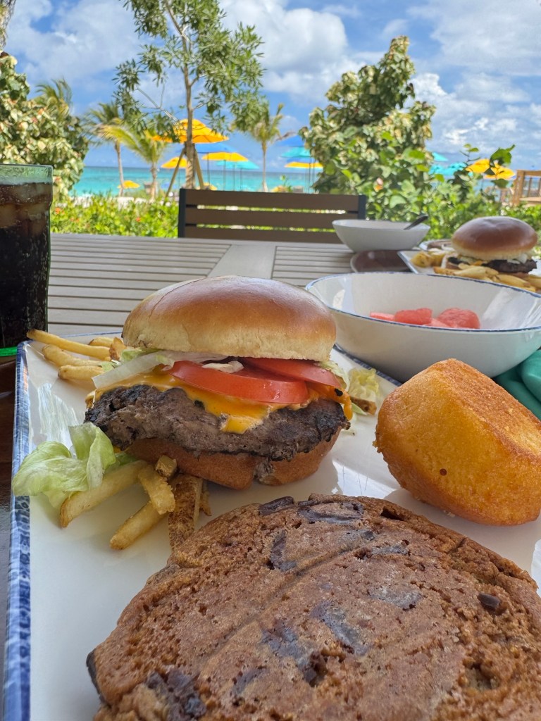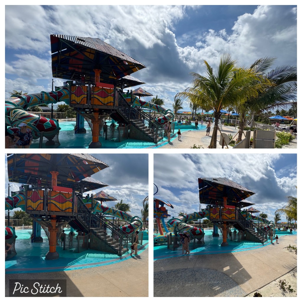 The Junkanoo is a parade in the Bahamas. It usually happens around 2 am since that is the coolest time of the day. After we watched the Junkanoo we went back to the adults section to grab some lunch. There were a few flies around the food area, so this part is still a work in progress. My issue was the counters are really deep. I couldn’t even reach the tongs to grab a burger! Luckily someone tall was in line and he was able to grab a burger for me. Same issue with the drinks. I had to lean on the counter to grab a cup and get a drink. I will have to try to family section next time maybe that is better for short people. We were able to find a table facing the beach and enjoy our lunch. No flies while trying to eat which was important.